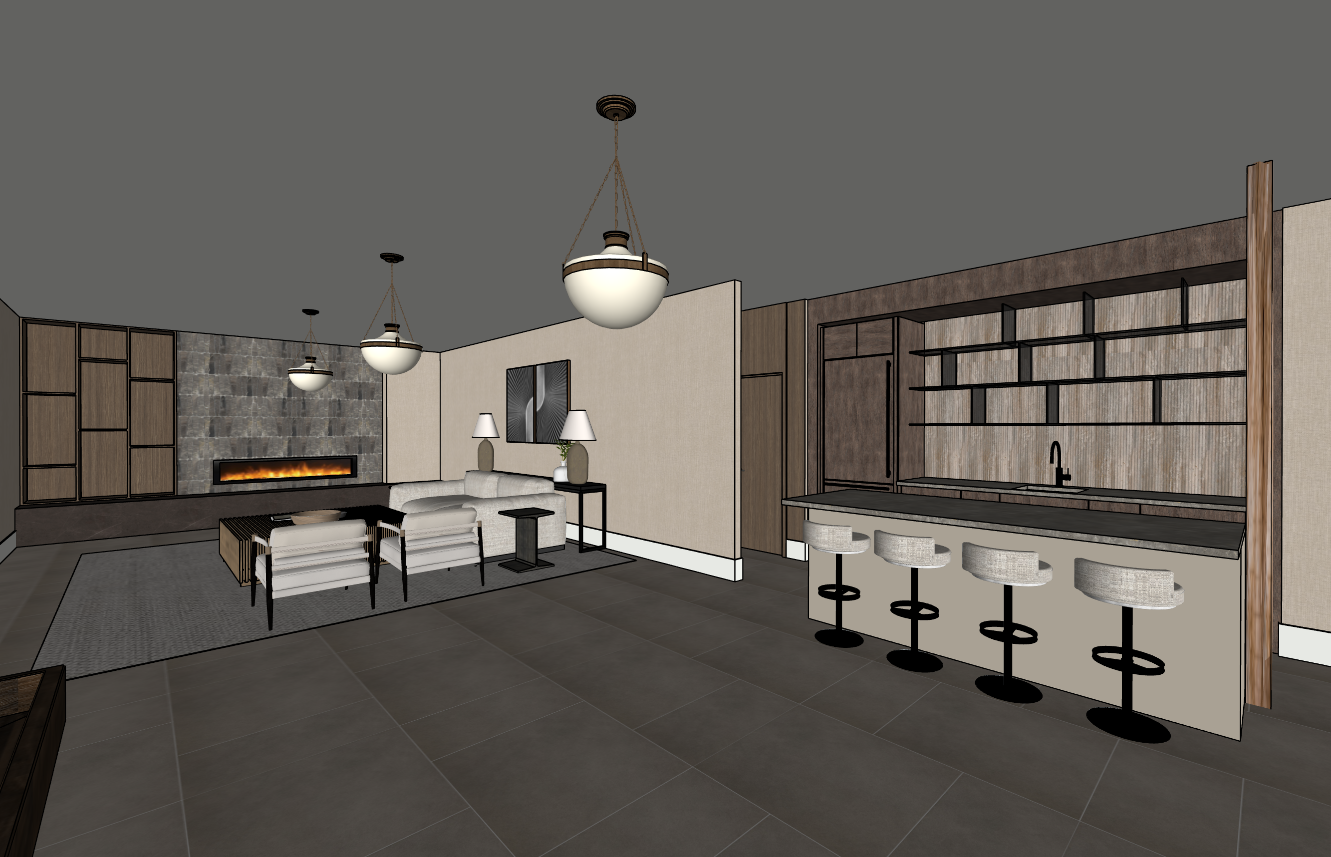 ultra photorealistic interior photograph of a modern mountain cabin bar and lounge area in private home maintain the exact architecture and layout from the original render a stone mosaic fireplace in front of a with a curved cream sofa and table lamps and a contemporary bar on the right with a grey stone look porcelain countertop four upholstered bar stools with black bases dark walnut bar cabinetry open black glass shelves with led lighting and a ribbed textured backsplash behind a matte black faucet and sink the space features warm neutral tones textured wallpaper walls vertical wood paneling and an exposed natural wood column materials should appear highly realistic taupe porcelain flooring with subtle variation textured woven wall panels rich walnut wood grain glass backlit shelves and soft boucle upholstery on the bar stools lighting should feel natural and cinematic soft daylight entering from off camera windows warm ambient lighting from table lamps subtle fireplace glow realistic shadows soft reflections on the stone surfaces and global illumination shot as professional interior architecture photography with a full frame camera 24mm lens shallow but natural depth of field extremely high dynamic range crisp focus subtle lens imperfections and natural exposure style similar to high end architectural photography seen in architectural digest dezeen and luxury mountain homes in jackson hole or aspen ultra detailed photorealistic materials ray traced lighting global illumination cinematic composition natural color grading realistic textures professional interior photography
