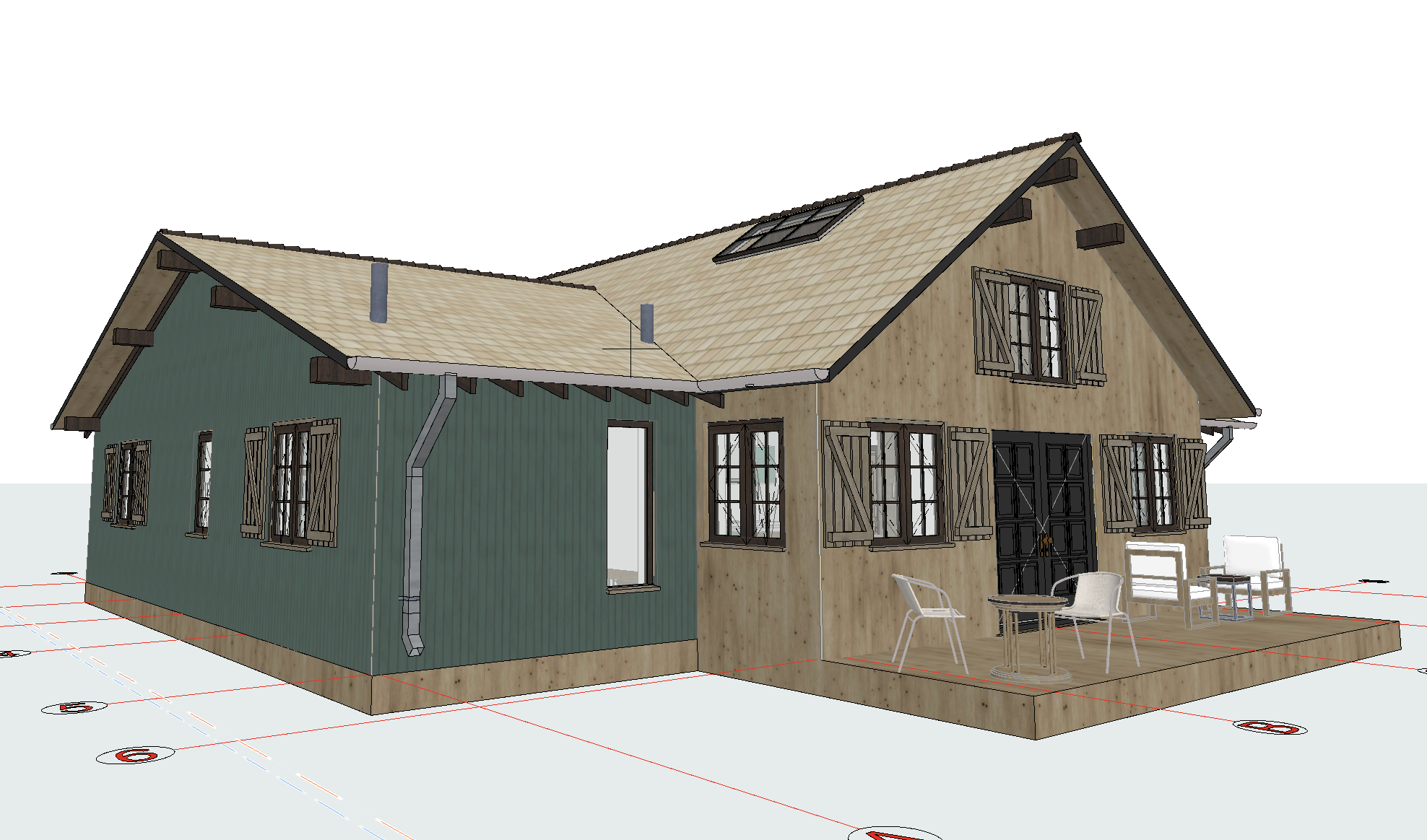 render a rustic house with a warm inviting atmosphere the walls are a rich dark brown wood accented with earthy green tones on the side walls the roof is a light beige with textured shingle tiles windows have light wooden shutters and the front door is a deep black the porch is decorated with light wooden flooring the overall mood is cozy and serene highlighting the harmony between nature and architecture under a clear blue sky with soft diffused sunlight and mountains and big trees and pines