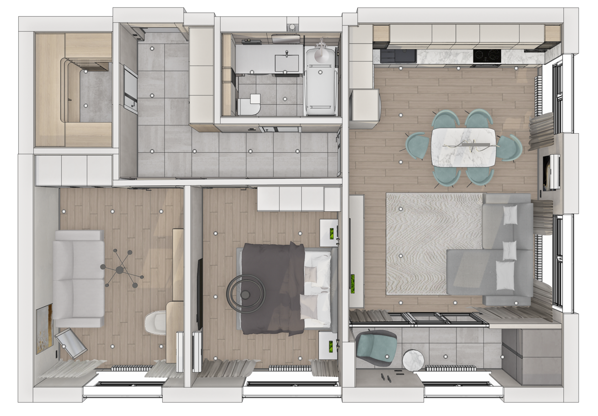 ultra realistic top view apartment layout photorealistic materials warm cozy lighting inside rooms soft natural light from windows realistic shadows and reflections modern interior design architectural visualization highly detailed realistic textures keep original layout and furniture positions