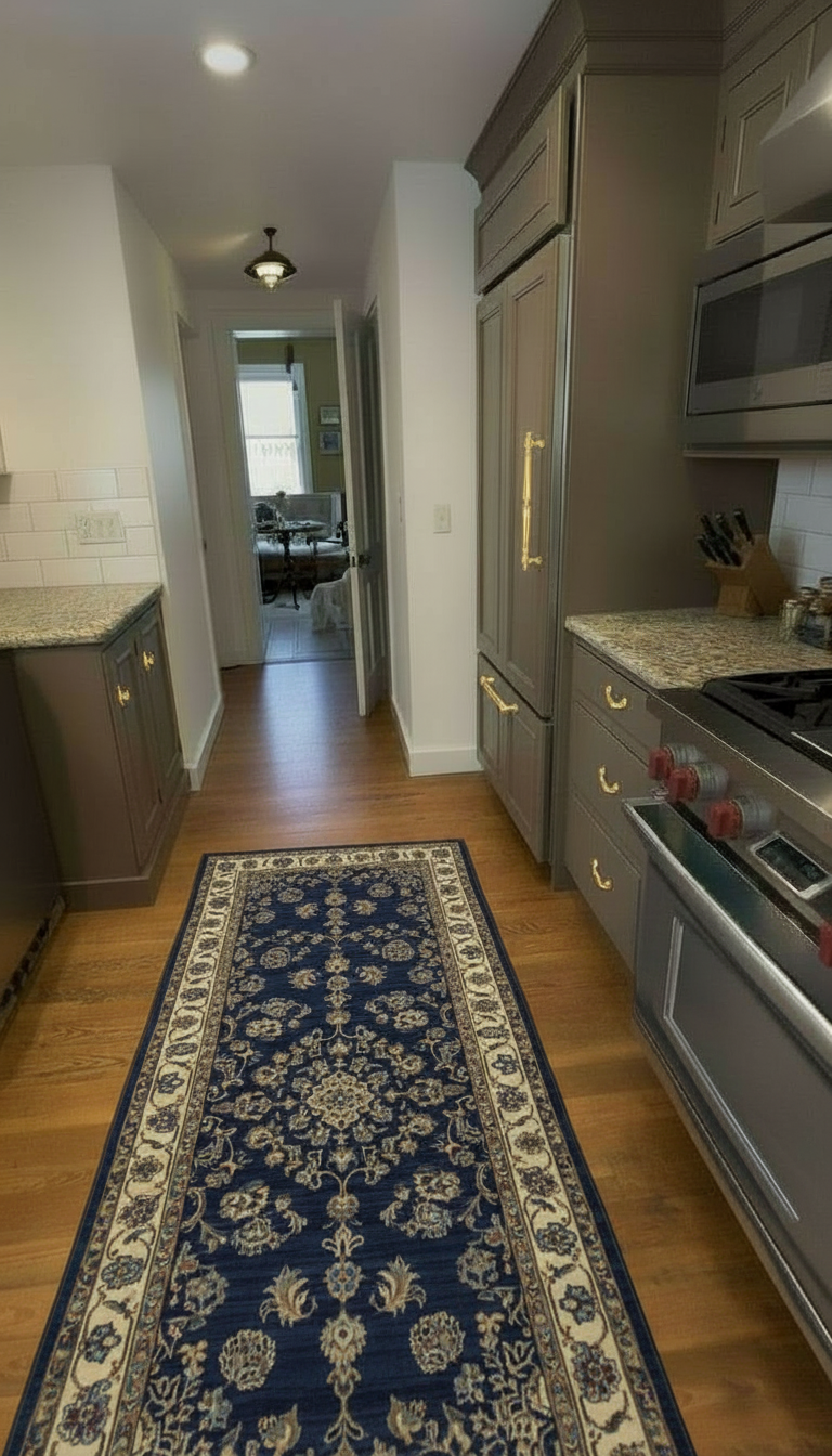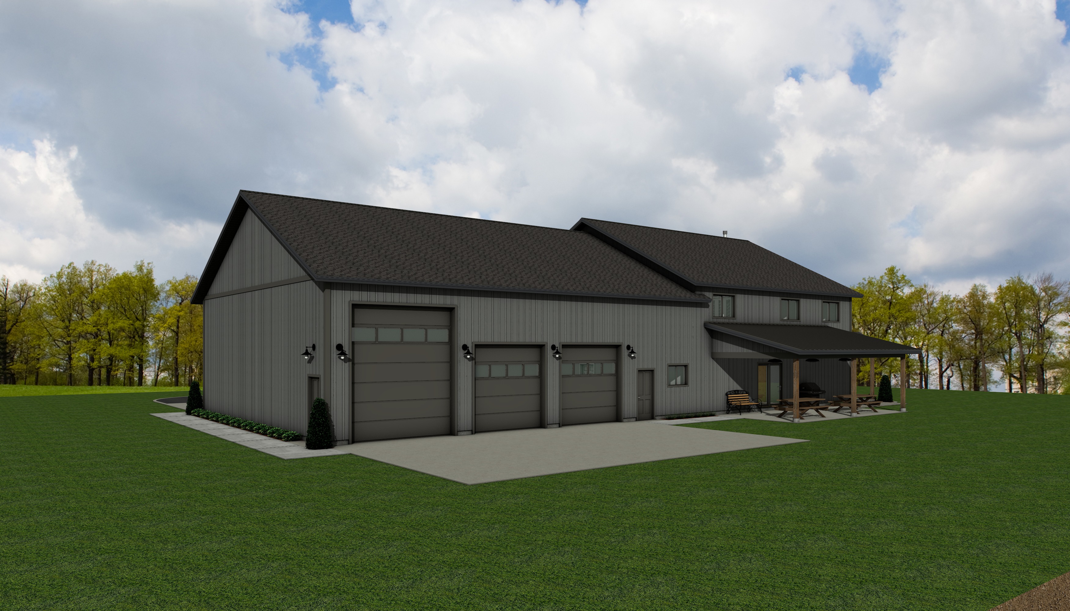 a photo realistic image of a modern house retain the exact structure colors and window arrangement rooflines shiny new metal siding foundation height railings wood stain colors and proportions exactly as shown in the reference image integrate into the terrain there are very few trees of mixed hardwoods that are mostly on in the distance of the image add warm diffused afternoon sunlight subtle dappled highlights across the siding and grass create ultra realistic lighting crisp shadows detailed textures in the siding and glass reflections and an overcast sky show only a few lights visible inside render in hyper photo realistic architectural visualization quality 8k resolution make it the fall season add realistic landscape add a large pasture behind the structure with white 3 rail farm fence the grass around the structure is mowed add some small landscape bushes and plants around the porch
