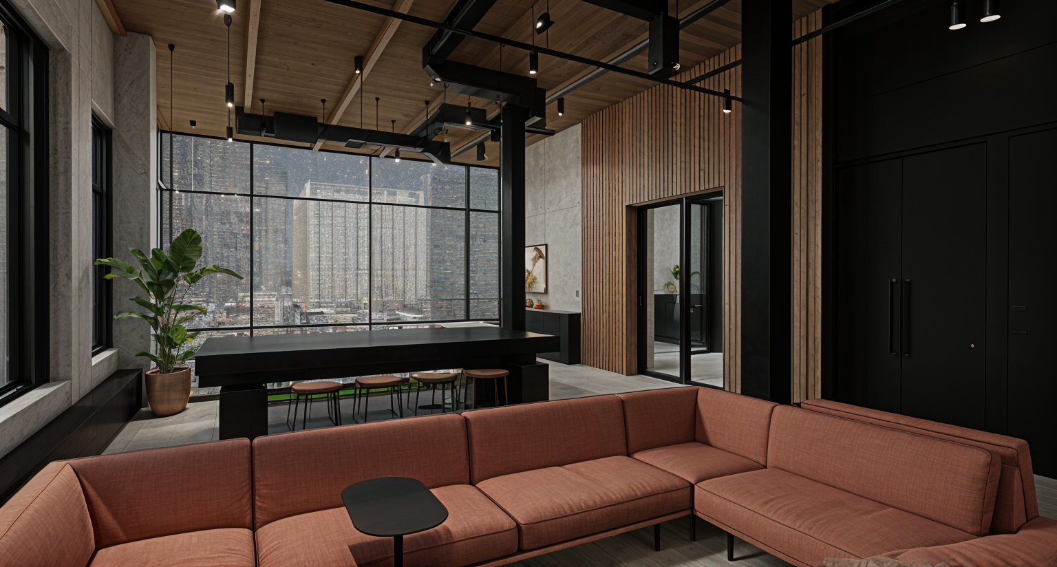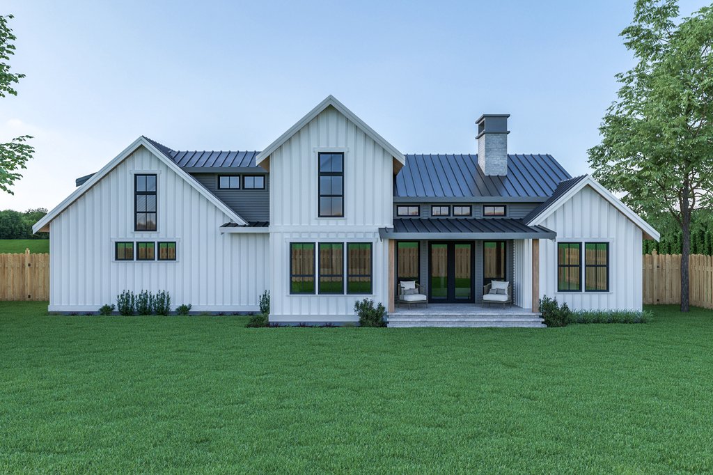 create me a rear elevation of this house siding will be white board and batten the window frames will be black the roof will be black charcoal the columns will be cedar