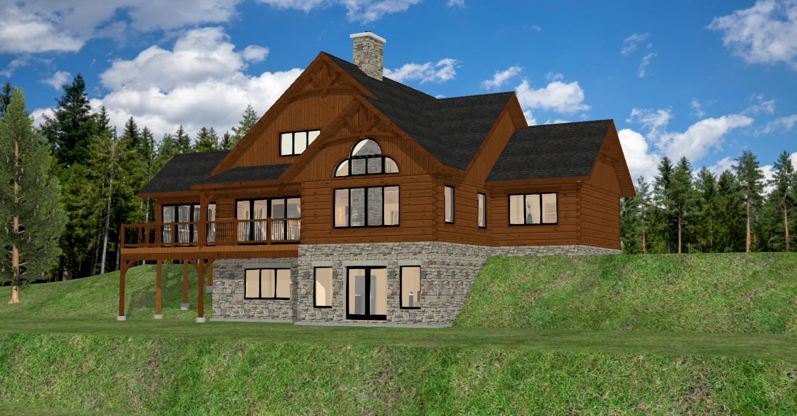 make this picture look photorealistic cut grass with pine needles ground flowers add tall pine trees in the foreground middle ground armour stone retaining wall at lakes edge in the very near front foreground black shingle roof black windows