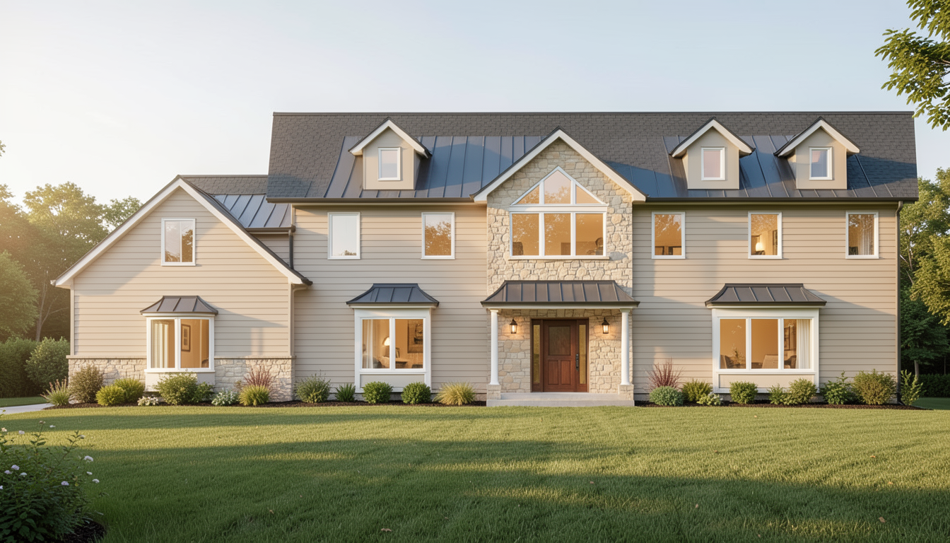 the exterior features mostly light beige siding and matching light beige stone veneer the primary roof is finished in dark gray asphalt shingles and the accent roof above windows areas in metal large bright windows with white trim provide crisp contrast the front entry door is finished in a rich dark wood tone the residence is situated within a well maintained landscape of lush green lawn and understated tasteful plantings with minimal floral elements warm interior lighting gently glows through the windows the setting captures a pleasant afternoon ambiance enhanced by soft glare from the afternoon sun creating depth and natural warmth throughout the scene
