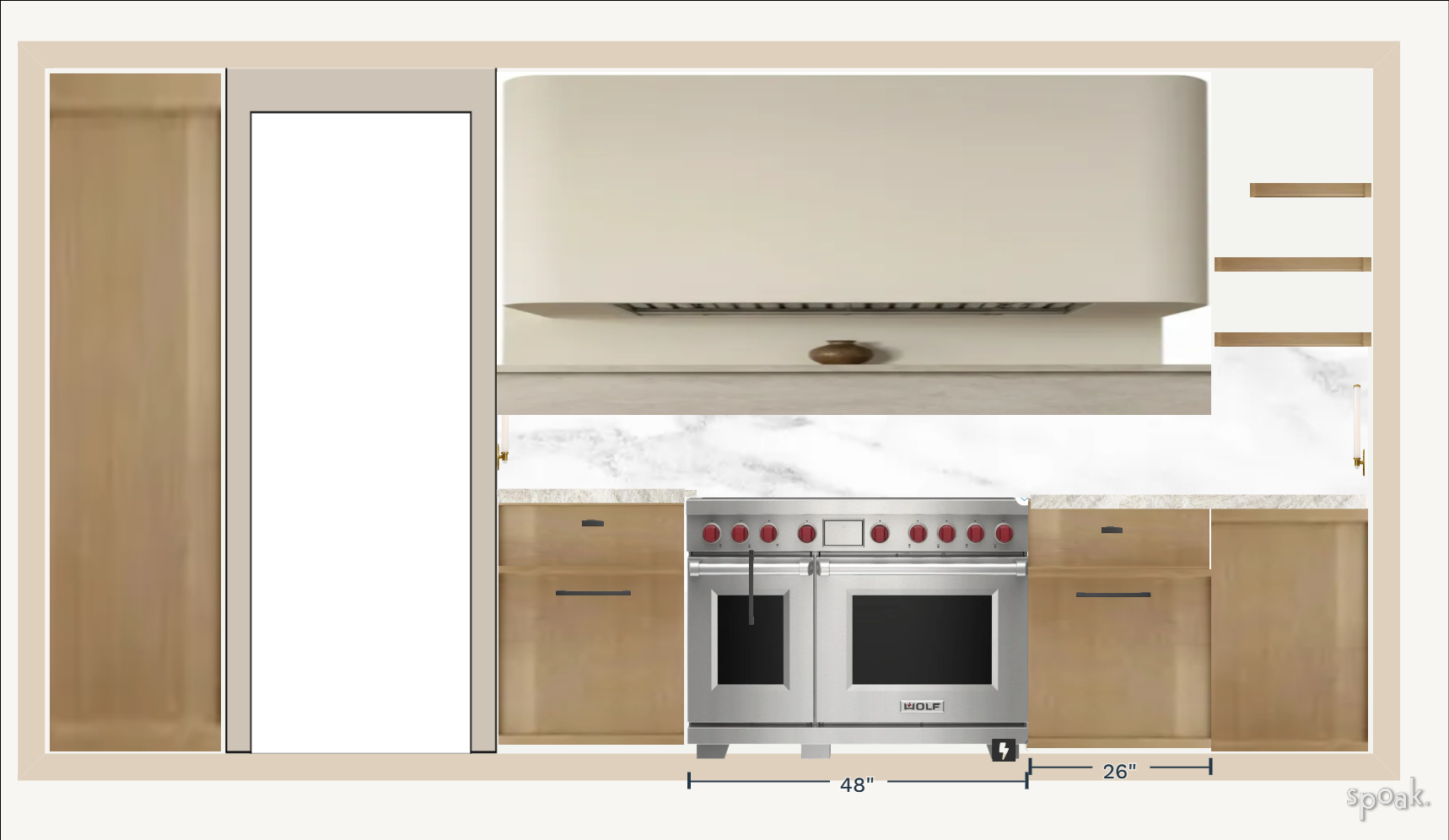 this is an elevation so the left and the bottom right cabinetry are for the side walls view create some depth on the sides above the range single wood panel is a hidden range hood there are built in sconces on either side of the range nook