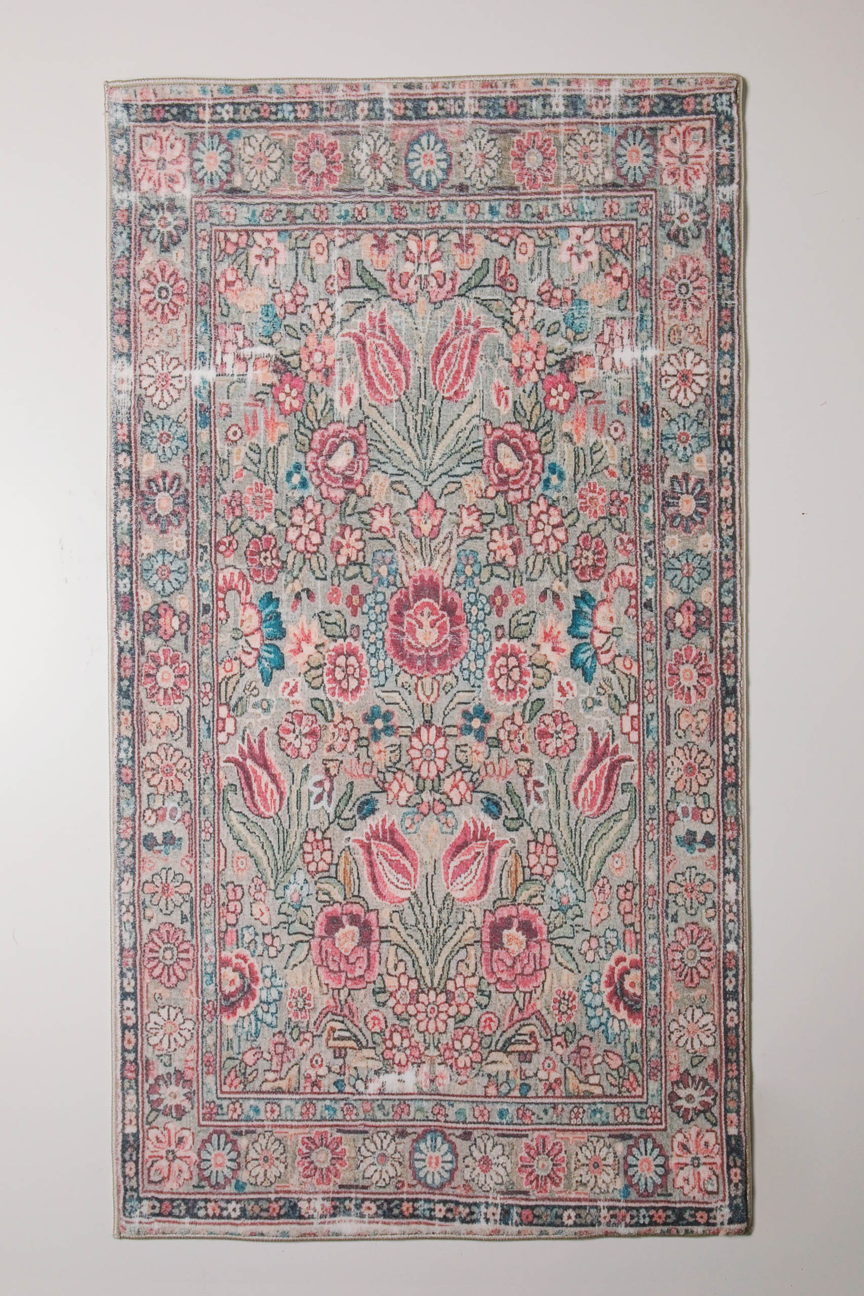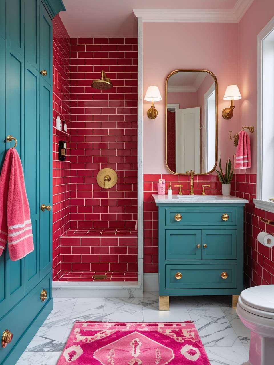 exterior shot photorealistic colorful modern bathroom interior normal eye level camera perspective use the uploaded bath rug product image placed naturally on the floor as the main focal point fully visible and centered taking most of the visual focus of the image bold vibrant bathroom design inspired by the reference image colorful wall tiles playful color palette teal coral mustard pink blue modern artistic style stylish bathroom furniture soft natural light with gentle shadows high end interior photography look shallow depth of field and composition focused on the rug extremely realistic textures accurate rug colors ultra detailed 4k