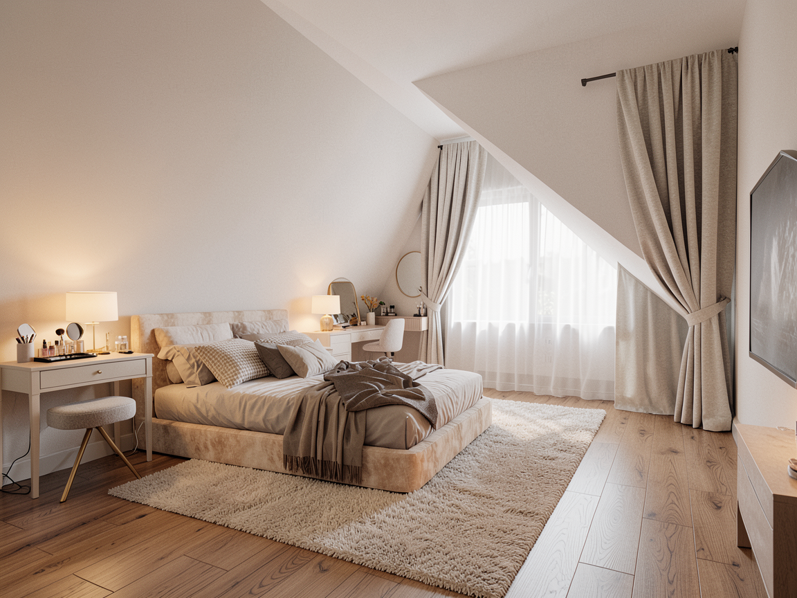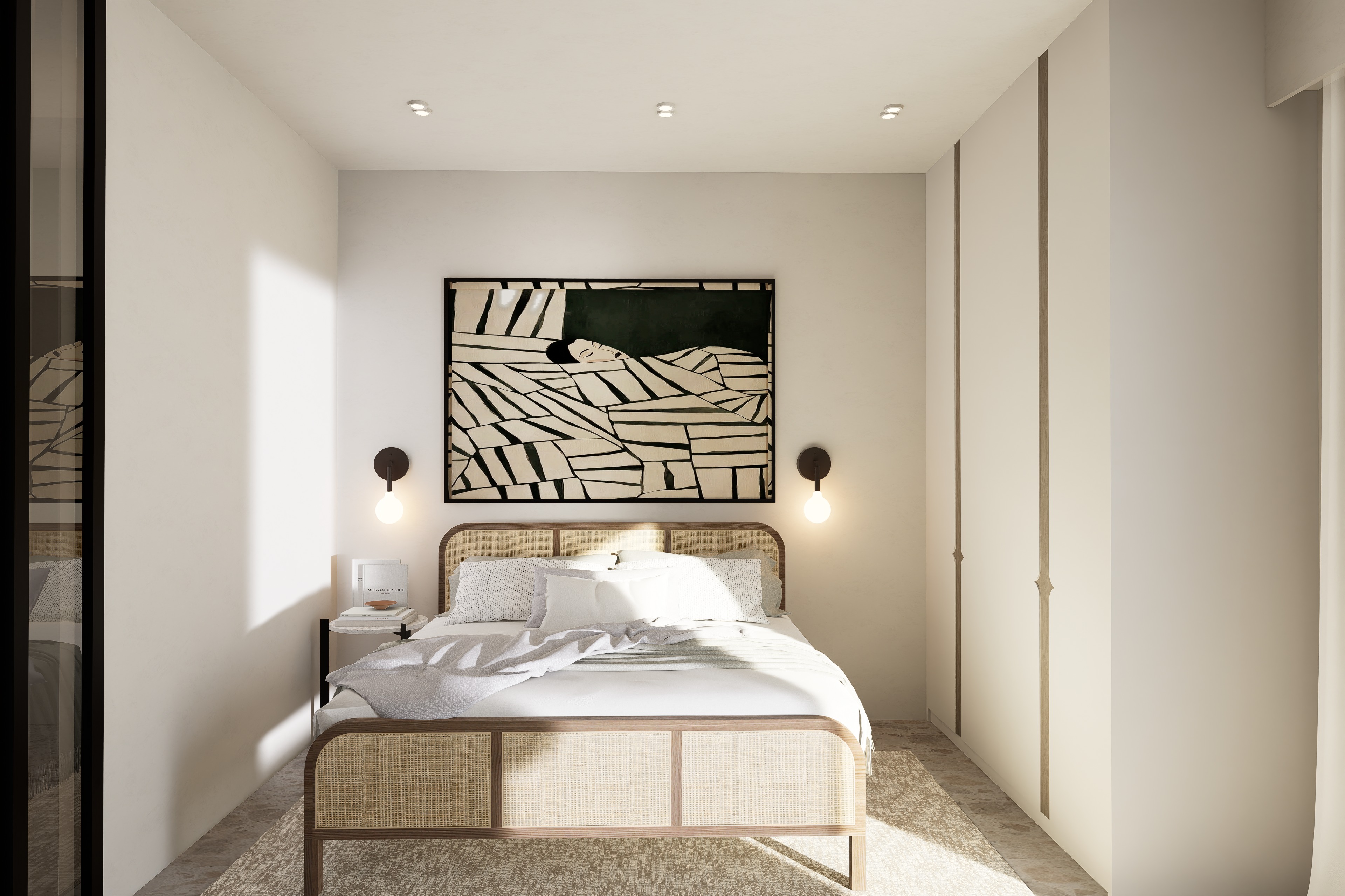 ultra realistic render of a minimalist bedroom keep the exact same camera angle composition proportions and layout from the input image do not change geometry or design scene center bed with warm walnut wood frame and woven cane rattan headboard and footboard bedding layered white textiles with subtle grey tones natural folds back wall smooth warm off white paint above bed large framed abstract artwork black off white muted green tones sides minimal nightstands with books lighting two wall mounted sconces with exposed round bulbs right side built in wardrobe with flat beige panels and vertical wood details floor light neutral stone or microcement rug soft beige textured rug under bed materials wood warm walnut tone matte satin finish visible grain cane natural woven texture slightly imperfect realistic depth walls smooth matte off white wardrobe matte beige lacquer dark wood vertical accents bedding linen cotton with visible weave and soft wrinkles floor light stone microcement subtle texture rug soft woven neutral lighting strong natural sunlight coming from right side light casting across bed and rug with soft realistic shadows warm glow from wall sconces 2700k balanced exposure no blown highlights realism photorealistic architectural visualization accurate shadows and light bounce real fabric behavior creases compression detailed material definition wood grain cane weave textiles slight imperfections for realism sharp clean high end 4k output strict rules do not change bed design or proportions do not move artwork or lighting do not modify wardrobe design do not change materials or colors do not alter camera perspective do not add remove elements only enhance realism lighting and render quality add this at the end strictly preserve original design and camera only increase realism
