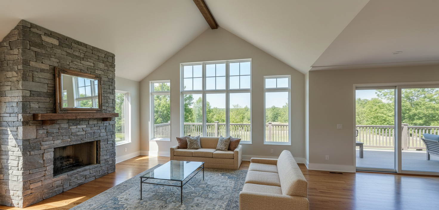 photorealistic interior architectural photography warm natural daylight under cabinet lighting and illuminated can lights in the ceiling soft directional light with realistic shadow falloff and gentle contrast bright but warm atmosphere realistic global illumination with subtle ambient occlusion in corners and at material transitions dslr with a 35mm lens eye level perspective professional architectural composition and framing and realistic depth slight depth of field foreground and midground in focus background softly flailing off physically based materials throughout with enhanced texture detail natural surface variation and subtle imperfections with realistic sheen high quality windows with realistic thickness subtle reflections of the interior soft exterior reflections and accurate light transmission windows feel transparent exterior visible through windows feels real and grounded with natural daylight realistic trees and landscape interacting with the light warm color temperature balanced with natural daylight soft highlights realistic shadows gentle contrast subtle camera noise natural exposure not overly sharp soften corners and edges professional photography style remove the people from the image