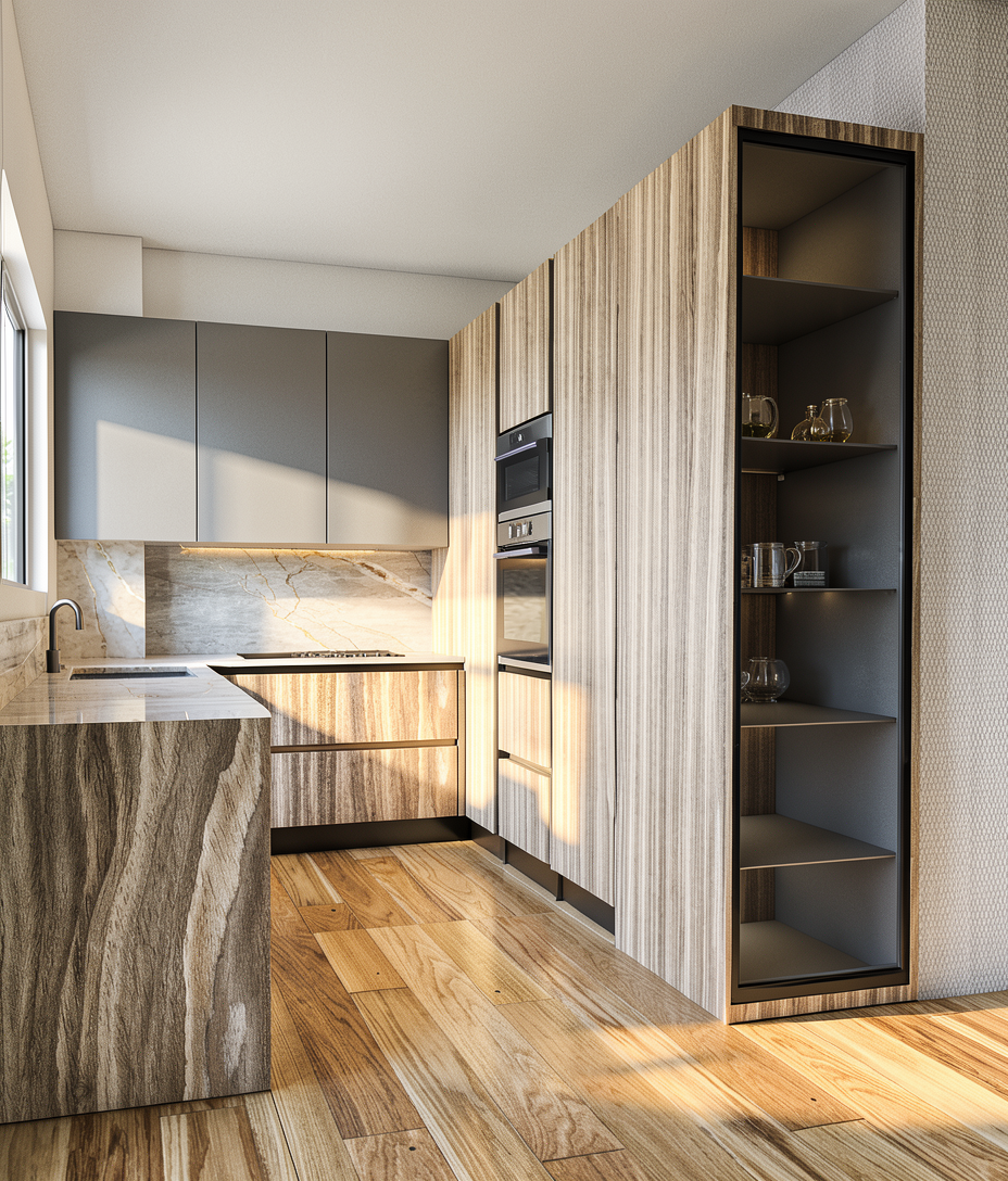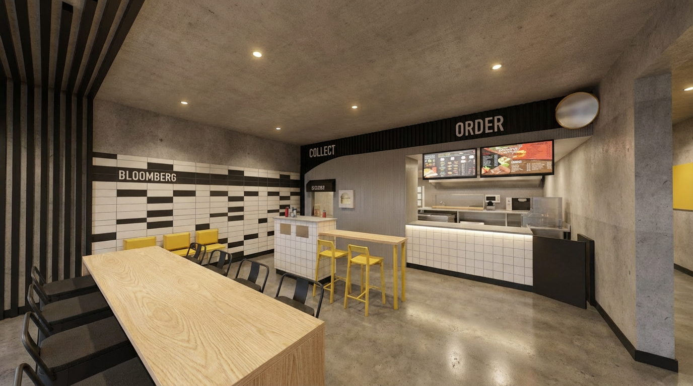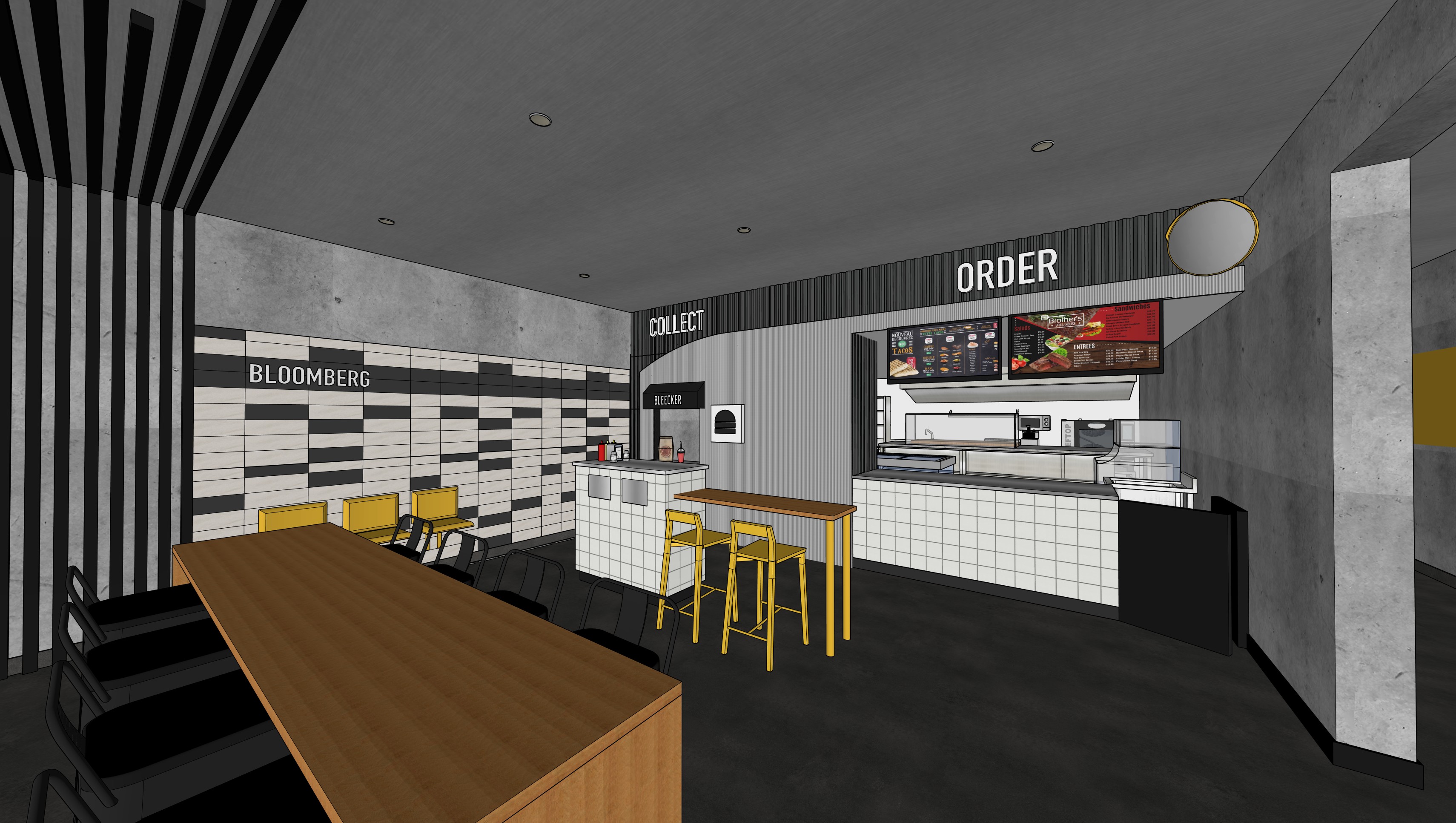 wood is too light needs to be iroko timber please also add led to front counter to downlight tiles make order and collect a neon light circle in top corner next to order needs to be a mirror do not change anything else