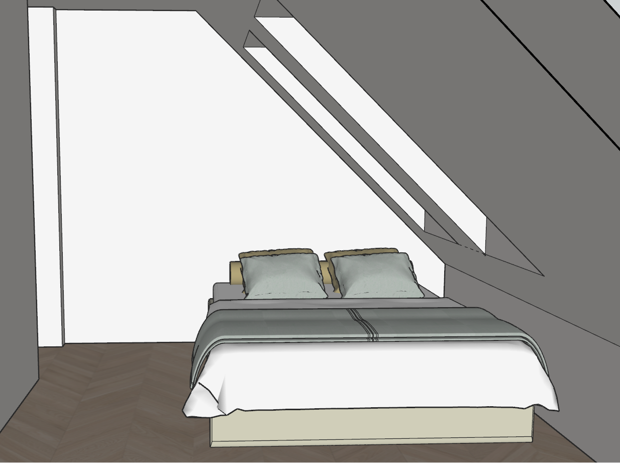 a cozy attic bedroom featuring a sleek modern wardrobe under slanted ceilings the wardrobe is painted in a soft sage green enhancing its minimalist design soft ambient lighting pours in from a large skylight above casting gentle shadows the walls are in a warm medium gray creating a calm and serene atmosphere a neatly made bed with a striped gray comforter sits in front complementing the tranquil vibe the floor is a rich light herringbone wood adding warmth to the space the atmosphere is peaceful and inviting ideal for relaxation also add white closed doors to the opening on the left side