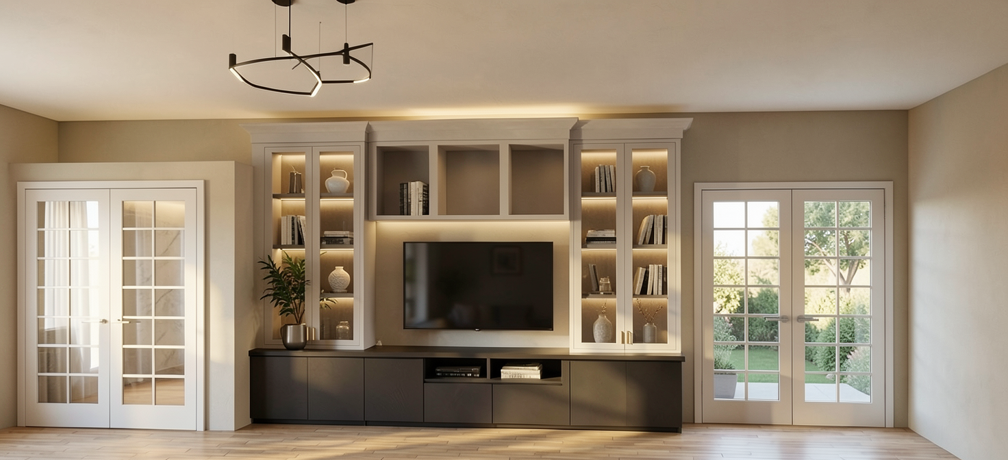 enhance with tv between tall cabinets