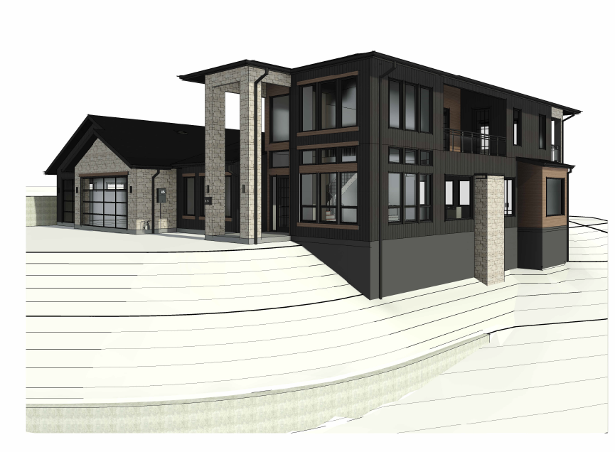 keep all exterior colors add textures add driveway with hammerhead turn around and landscaping hill sloping to the right side with oak trees lake view far off behind home sloping down with oak trees