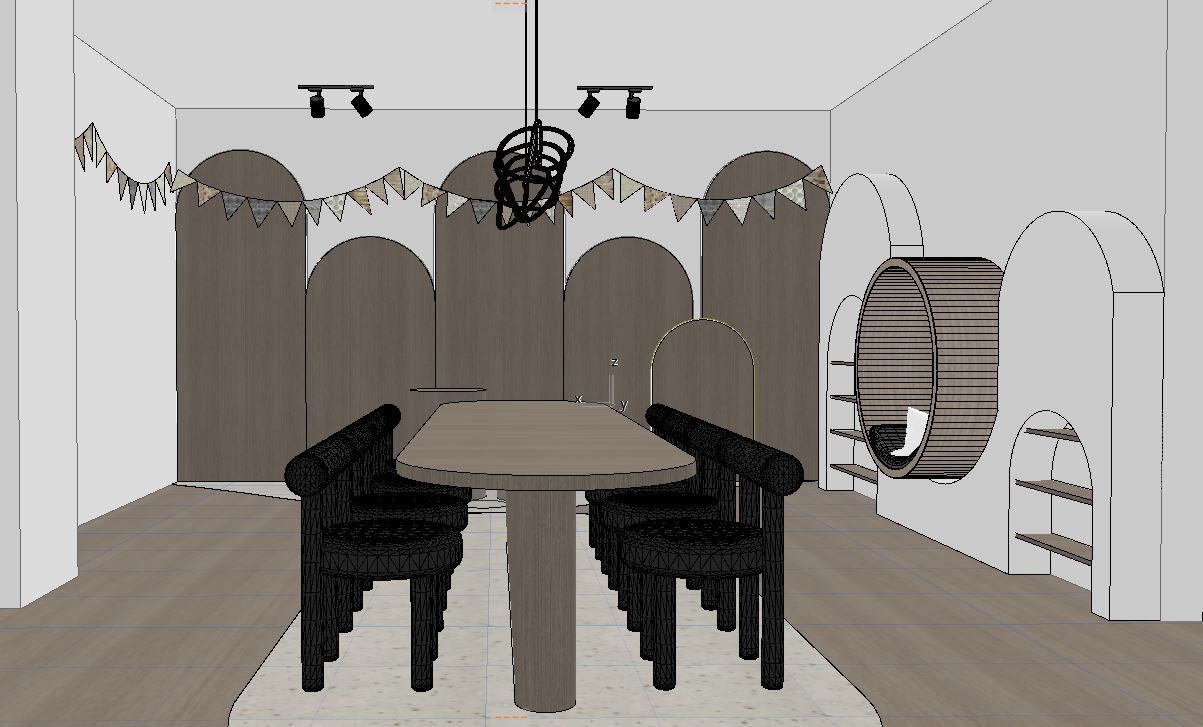 render the existing interior space exactly as it is do not change architecture layout furniture textures walls ceiling floors or materials keep all original objects and textures intact add minimal birthday decoration only elegant balloon arrangement in beige cream soft sage plus a few pastel balloons in light pink soft blue and mint organic balloon arch with varying sizes transparent helium balloons with subtle gold confetti modern matte white let s party sign on the left side of the room add a subtle playful wall wallpaper soft beige tones with minimal patterns tiny stars clouds or abstract shapes integrated naturally with the wooden scandinavian interior complementing the let s party sign fill the table with fully abundant playful decorations multiple detailed birthday cakes cupcakes with pastel frosting colorful sweets and candies in jars mini cookies tiny gift boxes party hats small vases with dried flowers decorative trays all carefully arranged to look joyful and abundant without moving the table maintain original lighting shadows camera angle and all textures add hyper realistic rendering soft volumetric light rays cinematic soft shadows subtle floor reflections depth of field realistic fabric and material details global illumination ray tracing physically based rendering pbr 35mm real camera lens high dynamic range ultra detailed textures 8k resolution photorealistic architectural visualization magazine style interior photography joyful playful atmosphere suitable for children s birthday party white chairs