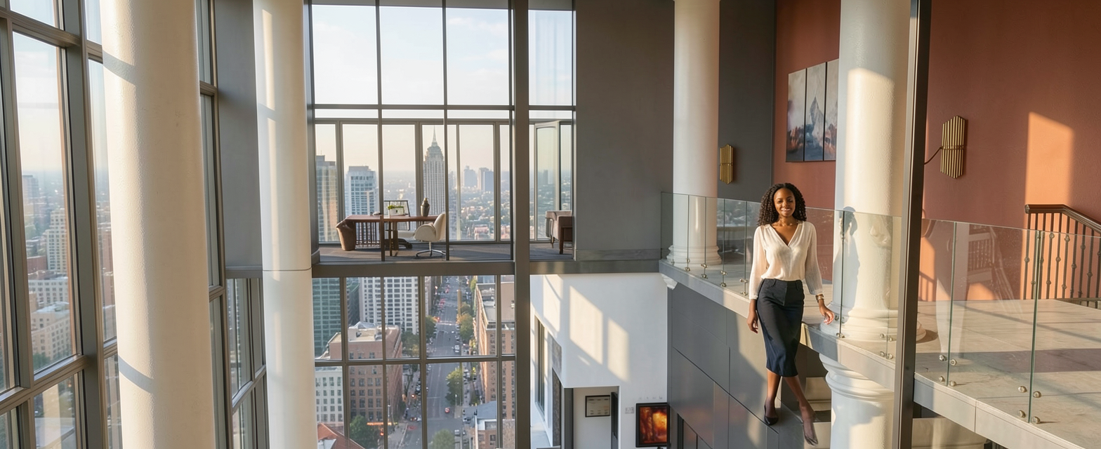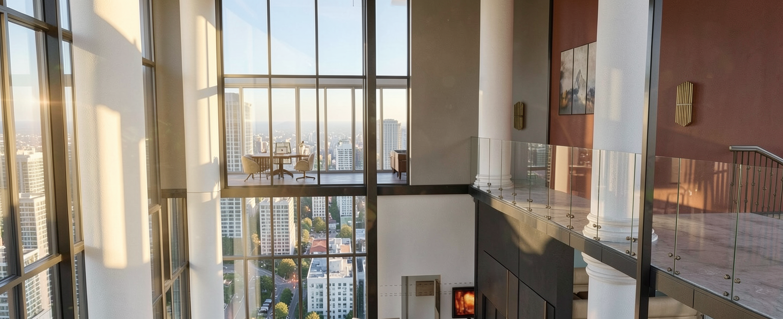 create a picturesque landscape featuring a modern to neoclassical residential complex the buildings showcase white walls with elegant black accents and warm dark brown terracotta roofs surround the area with lush green grass and vibrant trees using varying shades of green to add depth the road is a smooth dark gray asphalt lined with trees whose trunks are a natural brown and foliage a mix of light and dark greens the horizon reveals rolling hills painted in earthy brown and green evoking a sharp suburban night add green alongside the fence perimeter some kids playing in the garden sky blue with some white clouds add some furniture inside the villas and apartments please take care to show the details of the glasses of the windows they have a nice dark filament