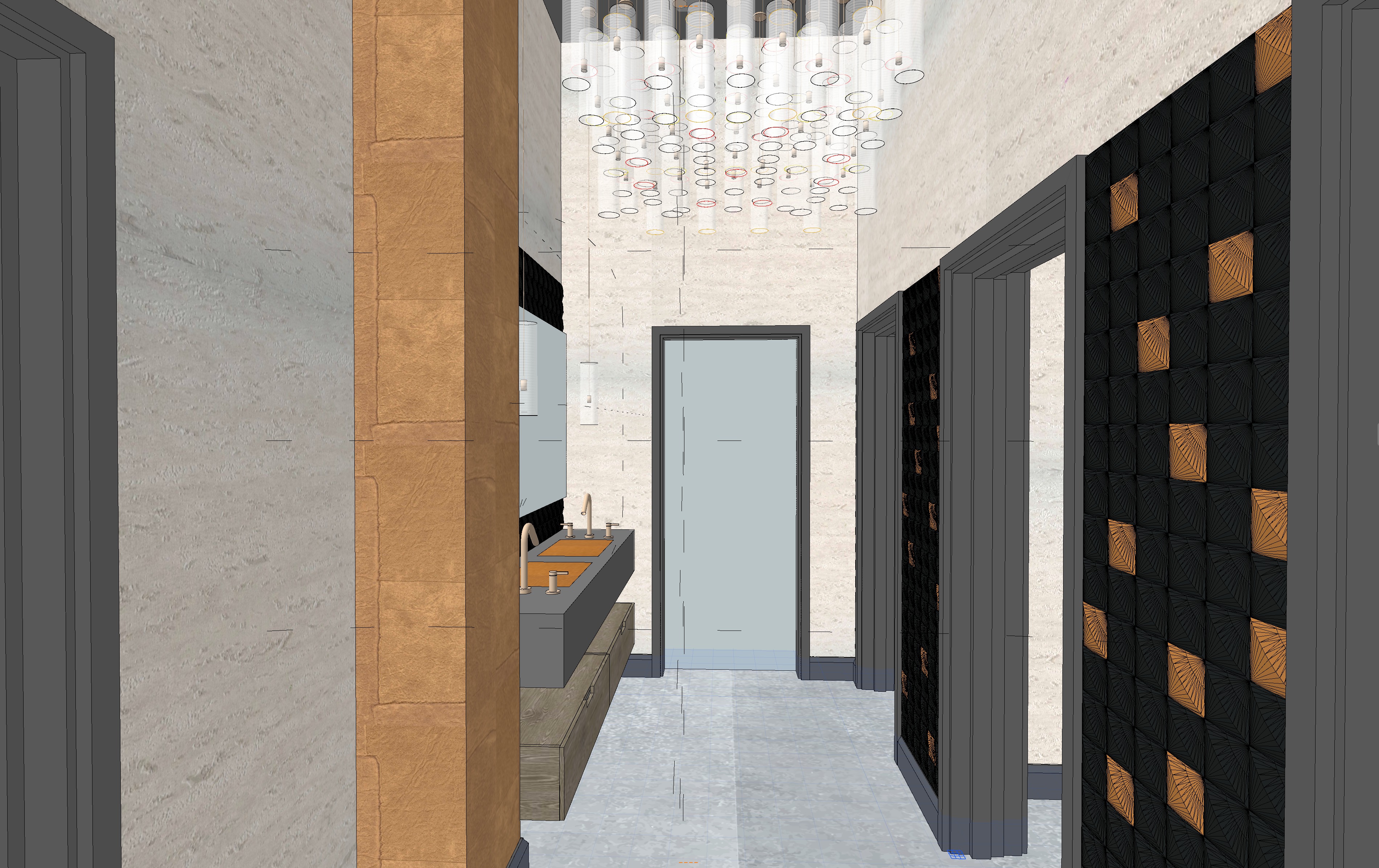 transform the provided bathroom interior image into a high end photorealistic render with warm atmosphere soft glowing highlights and with industrial style elements keep the overall architecture the same do not alter the elements the lamps on the ceiling should be metalic with a warm light make the inside of the frame mirror as well as the one on the left