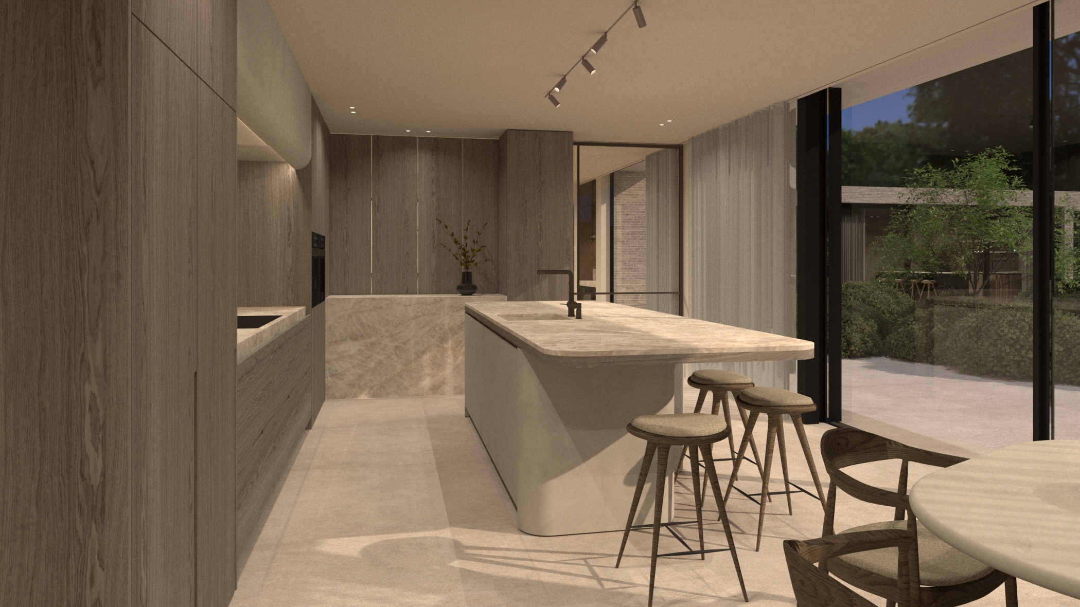 i want a photorealistic image of this render nothing may be changed in the content of the image the floor is a matte beige grey tile with no texture and abolute not glossy the natural stone is taj mahal type and has a slight gloss the wood is medium gray with slightly deeper grain the light beige base cabinets have a light plaster technique with a matte finish the curtains are grey sheer