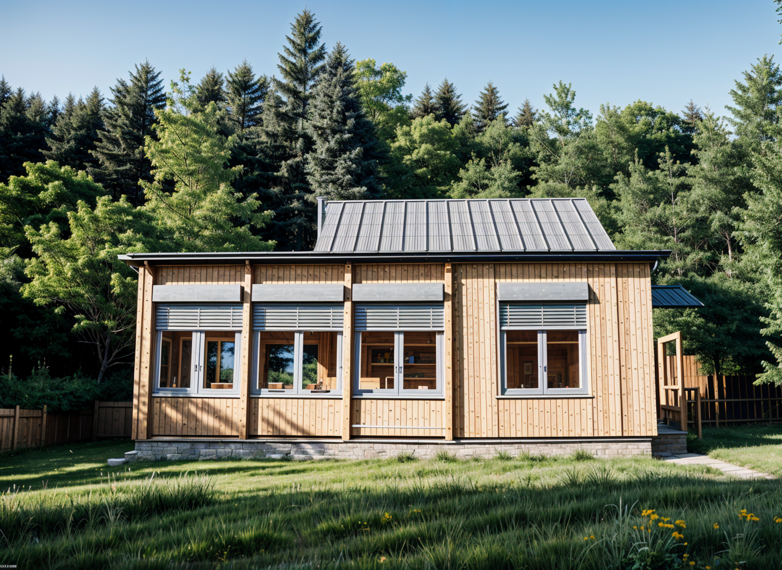 contemporary exterior shot 6pm forest background dark grey panels horizontal hatching as dark red brick dark cherry garage doors entry door architecture