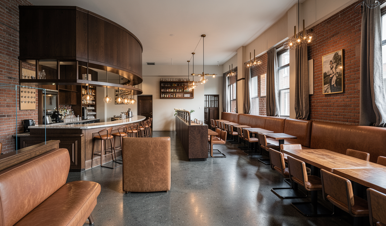 wood stairs steel pickets leather handrail wood floor and ceiling plaster walls plant on table green field landscape remove table in corner