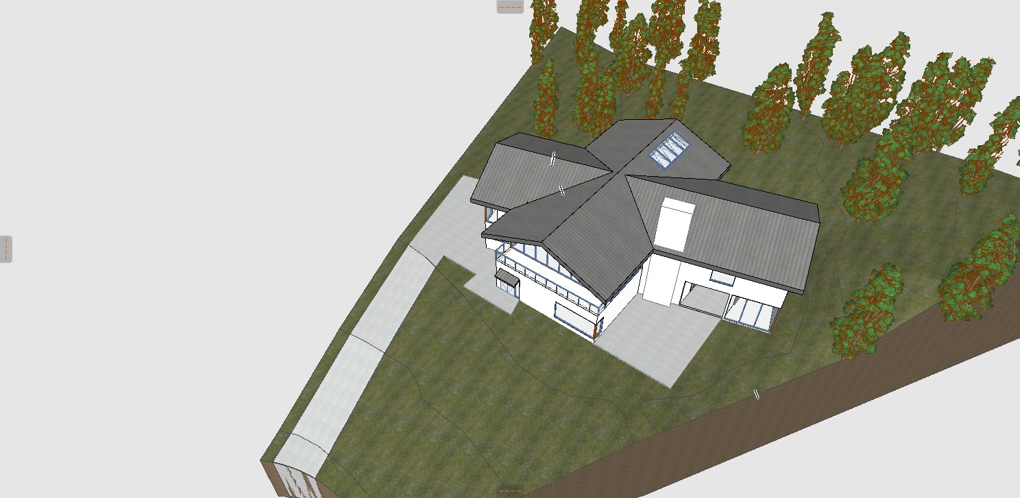 exterior shot render this perspective of the same house in the reference image use the same materials same vegetation same atmosphere do not change the form or materials of the building and pavement be careful to not obstruct the concrete pavement