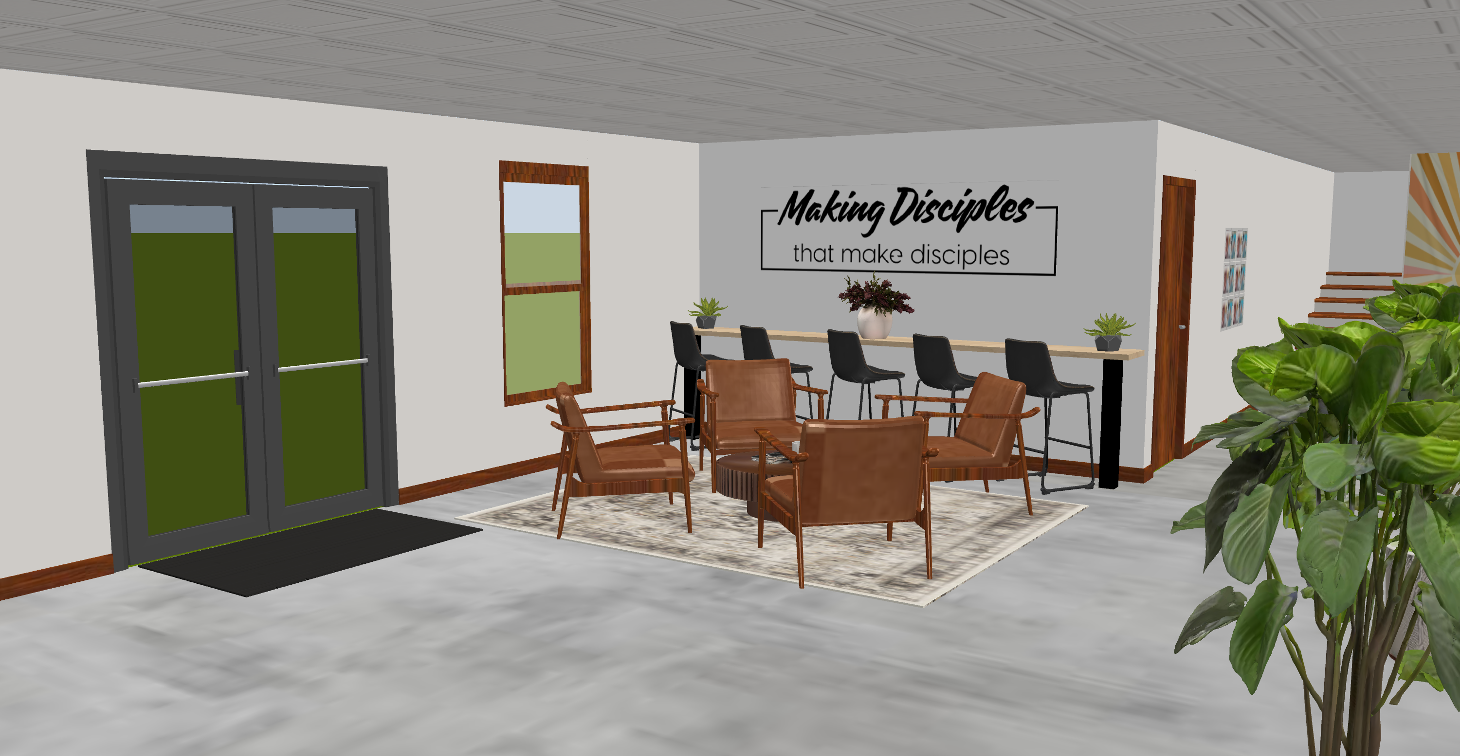 interior shot floors are a beautiful finished concrete floor sign above butcherblock bar say making disciples and under that says that make disciples use plenty of natural light