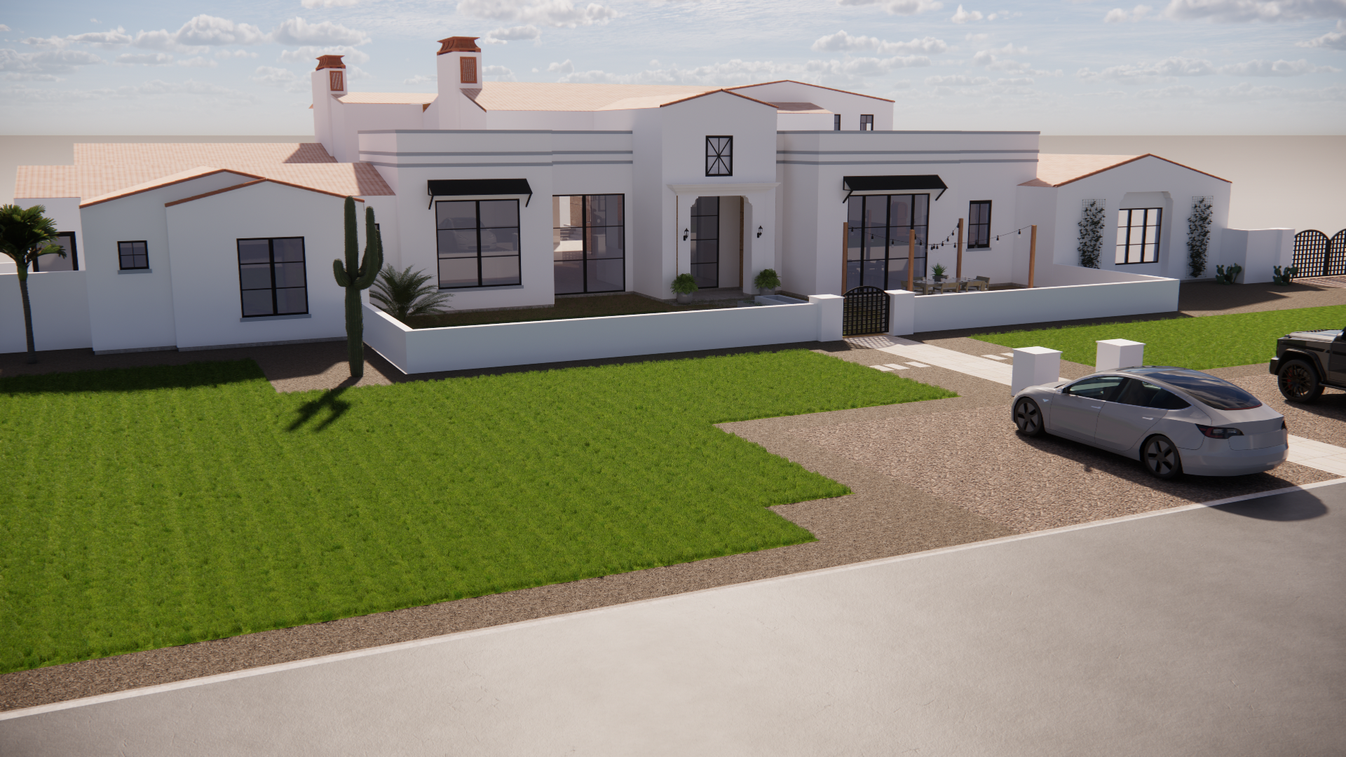 this house is in phoenix arizona i want a photo realistic rendering at 3 pm in the afternoon with partly cloudy skies