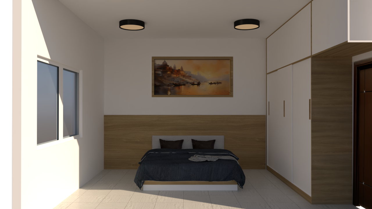 interior shot a modern minimalist bedroom with warm color palette the wardrobe has ivory shutter finish with wooden finish on the sides queen size modern bed with fabric upholstered head board and side table in wooden finish calm and soft touch curtains that add texture to the room well lit ceiling lights and led lights behind the wall panelling the room is warm and cozy with good lighting