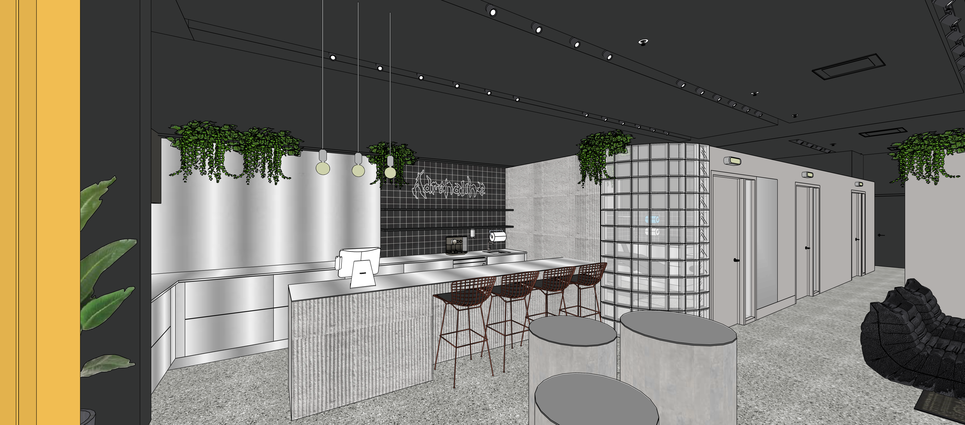 keep view and material as is backsplash is black glossy tile remove led sign we have on the left of the tile a brushed stainless steel pannel and stainless steel cabinets adrenaline led with a glow middle cylinder has glossy black tops add glossyness to the floor keep same texture