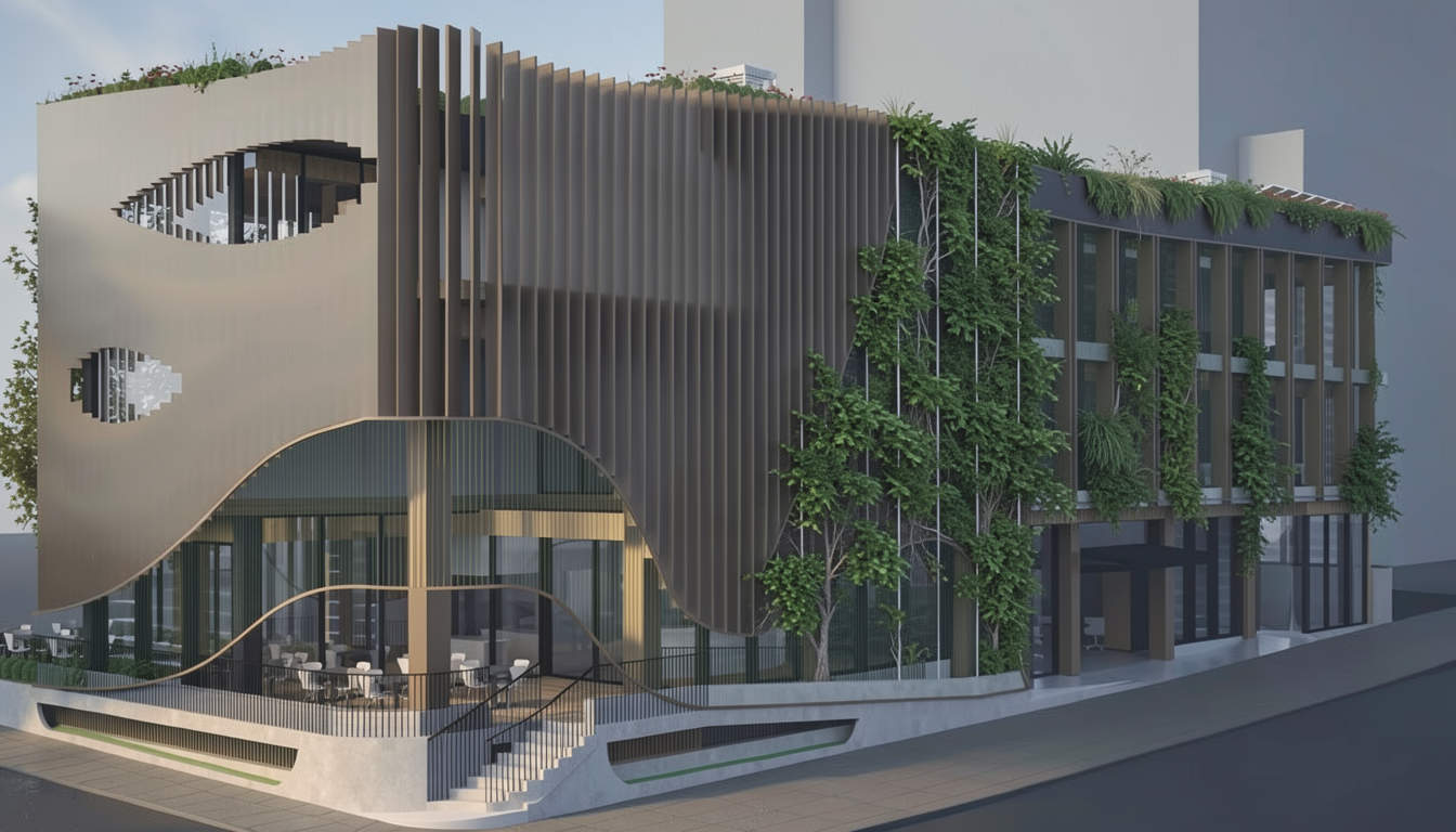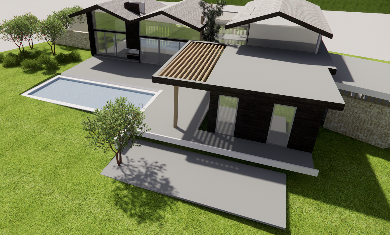 edit the provided architectural rendering while strictly preserving the exact architecture of the project do not modify the building geometry volumes roof shapes roof slopes overhangs windows doors chimney pool terraces or fa ade composition the architecture must remain exactly identical improve the camera perspective to create a more professional architectural view adjust the viewpoint to a slightly lower eye level and a more balanced three quarter angle so that both volumes of the house and the swimming pool are clearly visible the perspective should feel natural and architectural similar to professional architectural photography use a moderate wide architectural lens approximately 28 35 mm equivalent to reduce distortion while giving depth to the scene keep vertical lines perfectly straight and avoid exaggerated perspective distortion keep the rectangular swimming pool aligned with the architecture and visible in the foreground improve materials and lighting with realistic textures natural wood cladding stone walls dark metal frames and soft daylight enhance the landscaping slightly while keeping the same positions of trees and planting areas important improve only the perspective lighting and realism do not redesign or modify the architecture