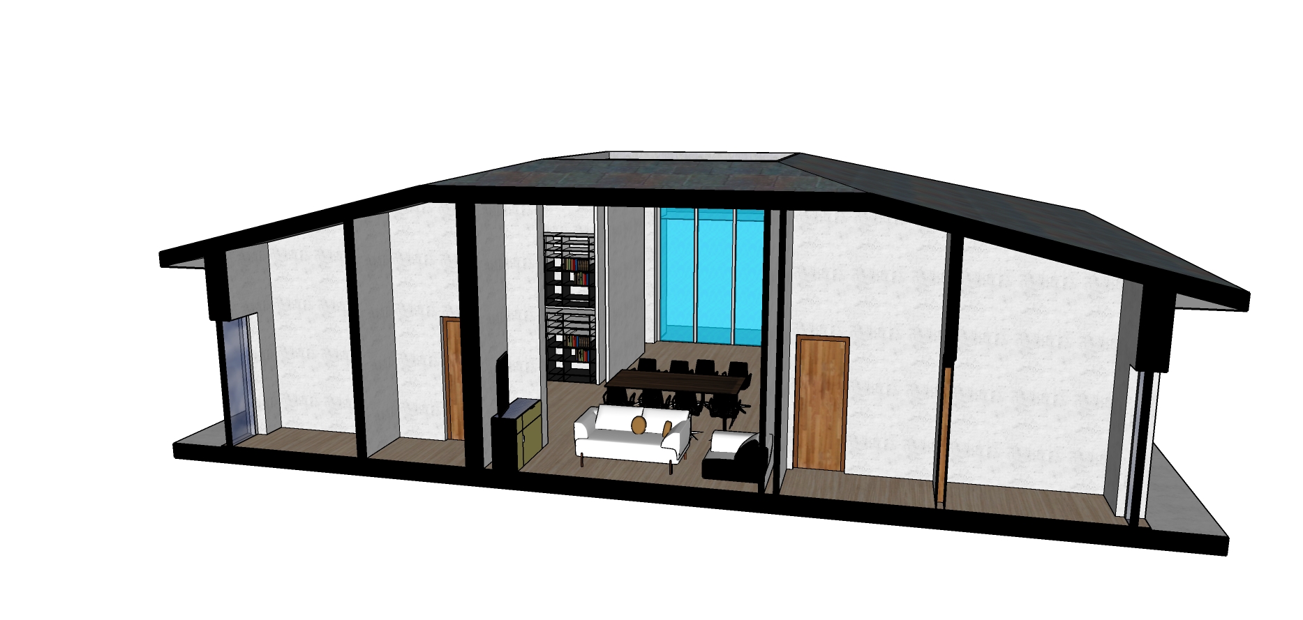make it a modern house in nature add some trees to the side this is a section so no need to add glass panels to the front focus on the interior make it modern yet warm dont add anything in the corners like stairs fell free to add some chairs maybe or plants