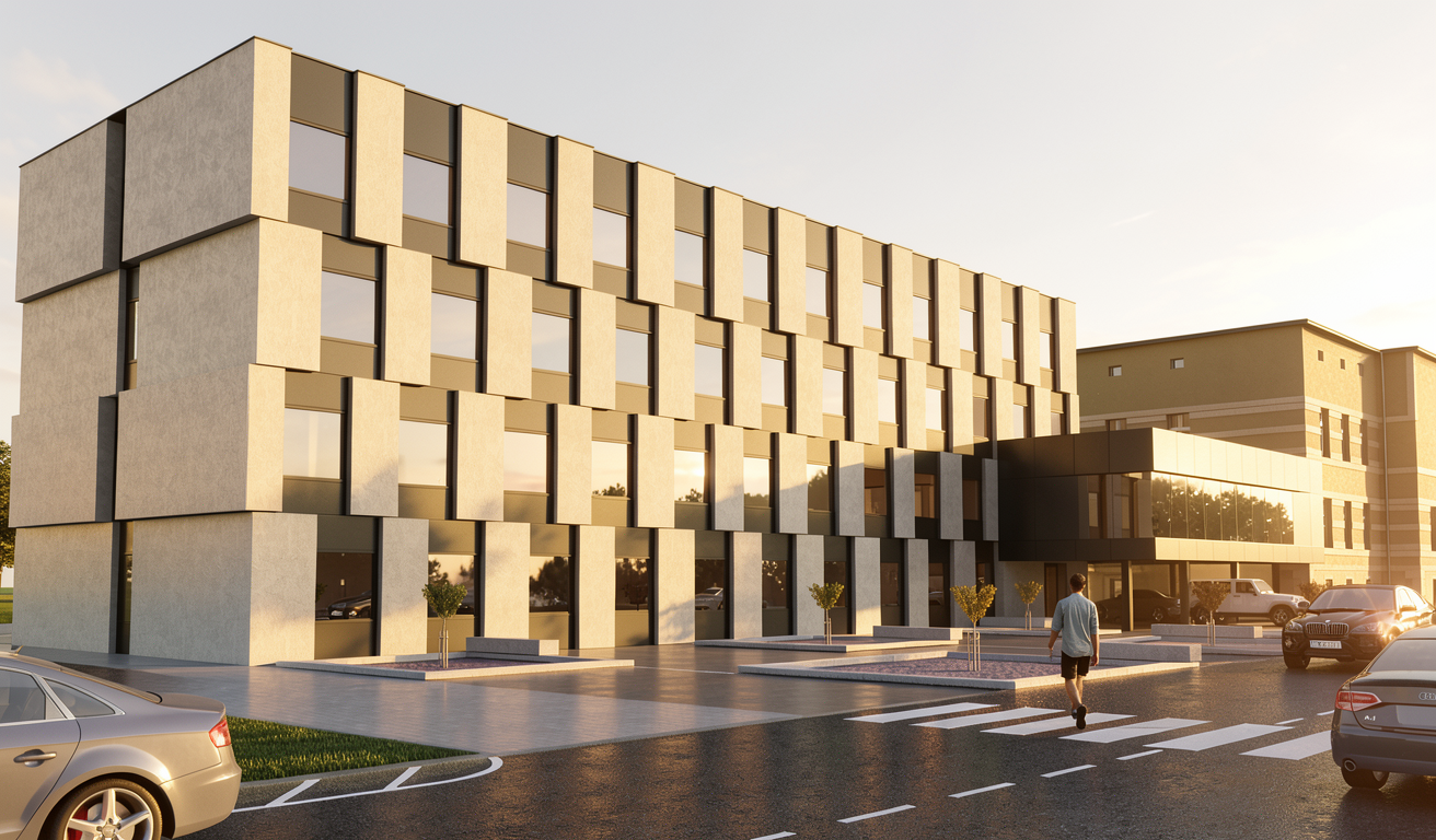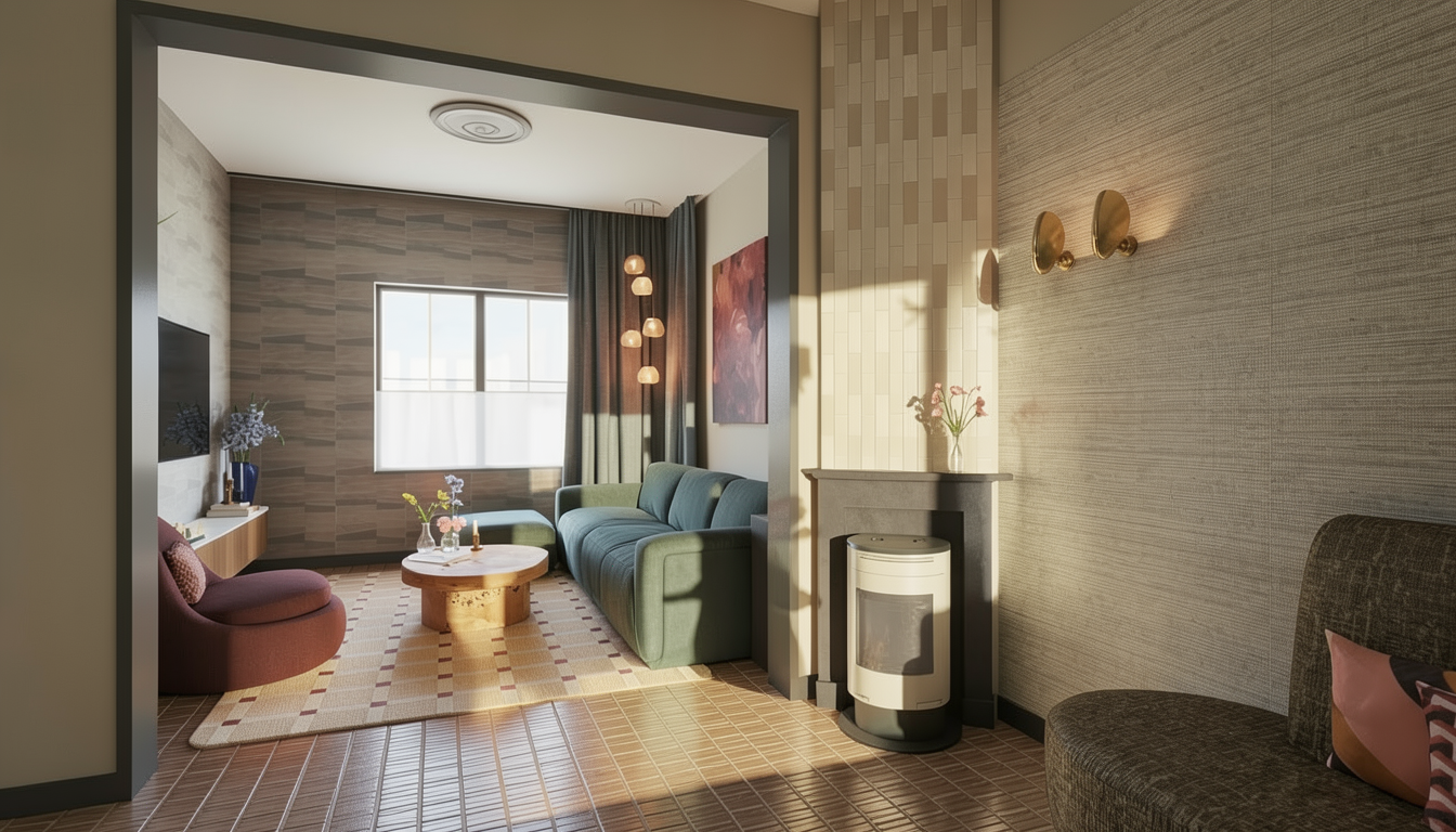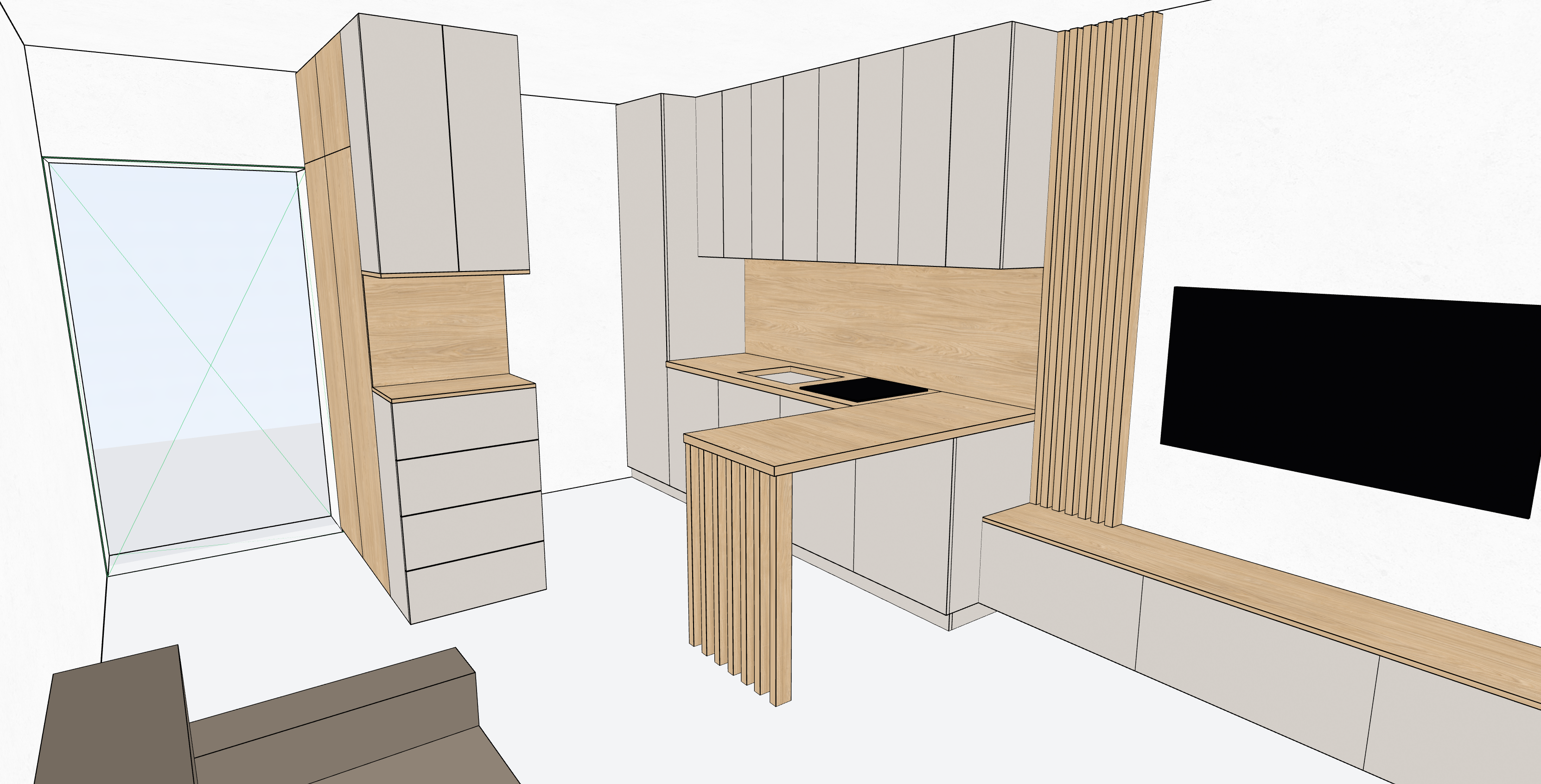 a modern kitchen interior with sleek cabinetry in a soft beige color complemented by smooth oak wood elements for the countertops backsplash and vertical slats the left wall features a white entrance door the walls are a crisp white providing a clean open feel a light brown sofa is positioned in the foreground the atmosphere is calm elegant and contemporary emphasizing simplicity and functionality