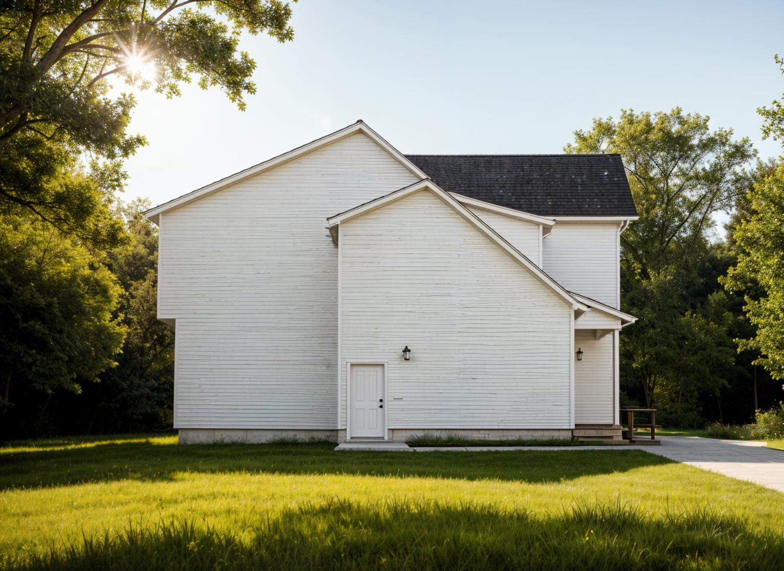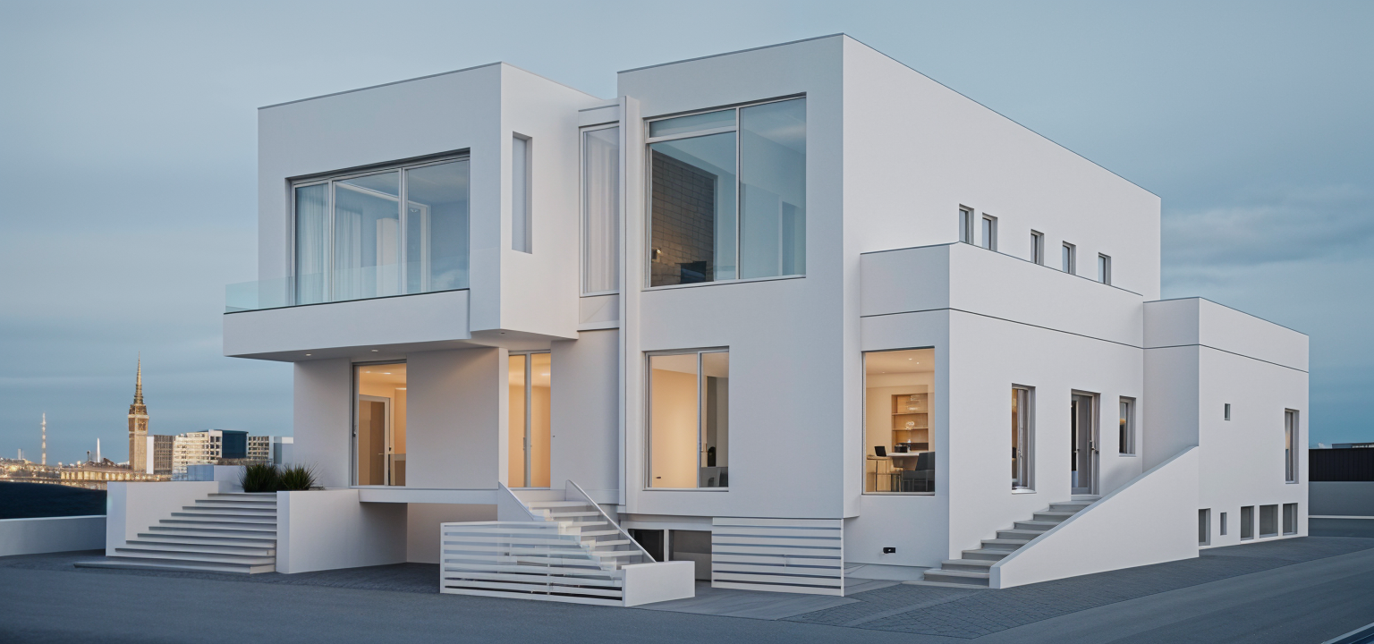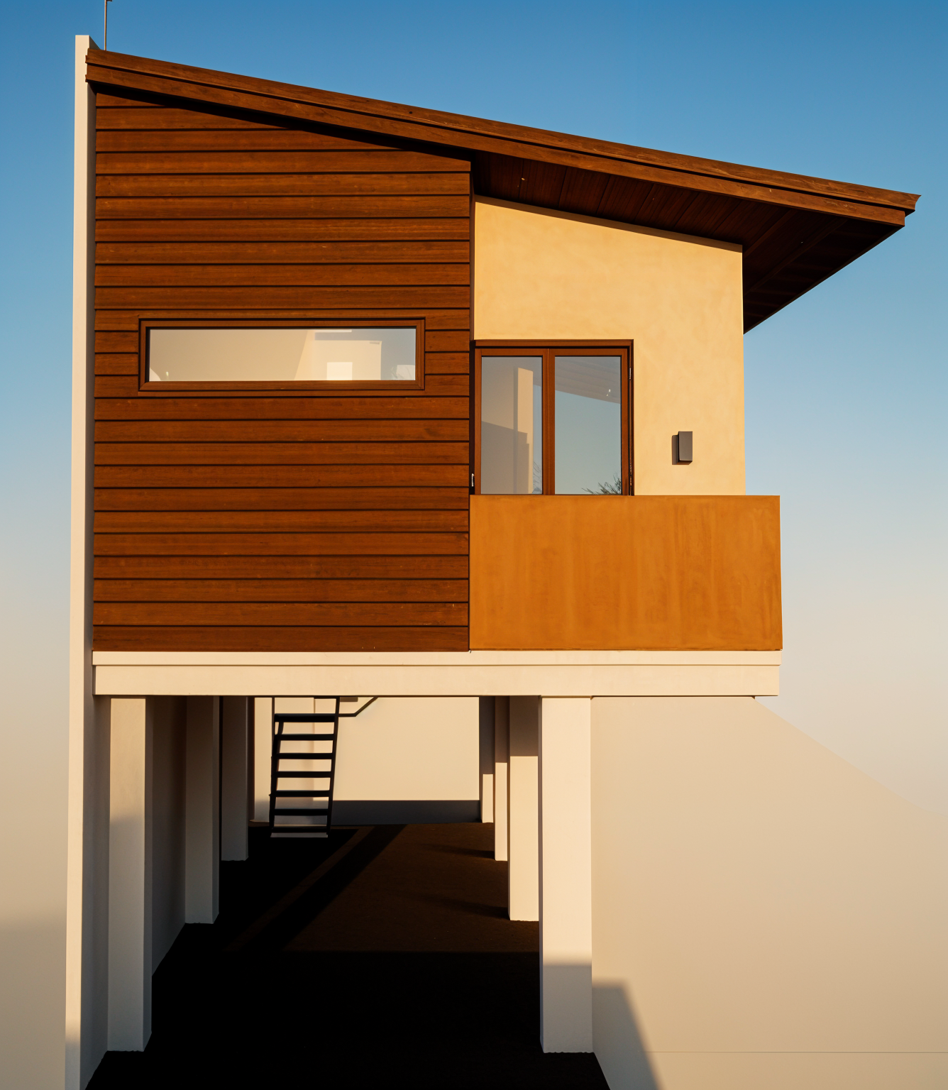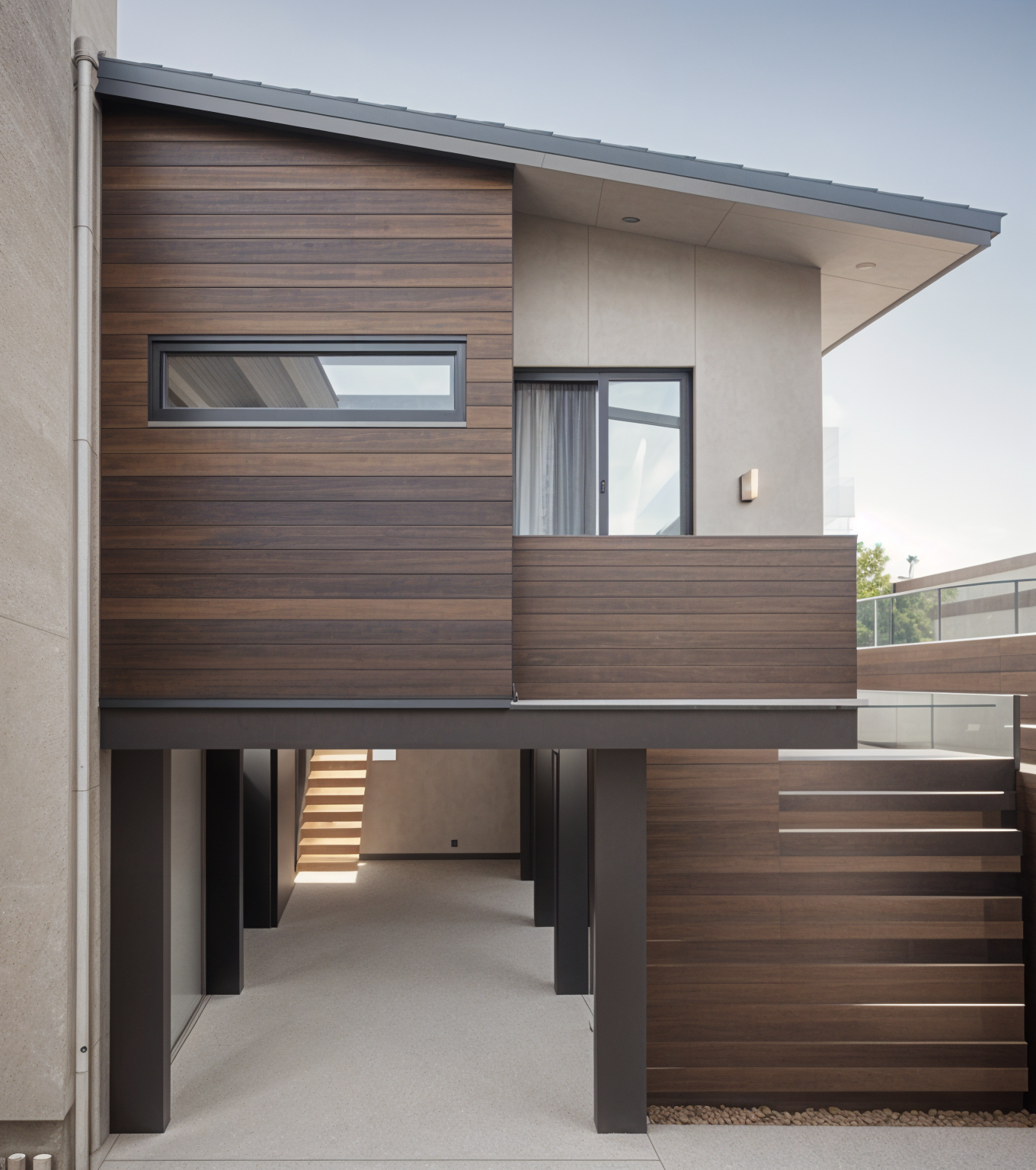 realistic rendering of a modern tropical elevated house with dark brown horizontal cladding a light brown balcony and gray window frames the interior should appear softly illuminated through the windows with a warm lighted wall lamp on the exterior wall use a natural wood ceiling with visible grain and a dark gray sloping roof emphasize warm tropical lighting realistic material textures and clean architectural lines