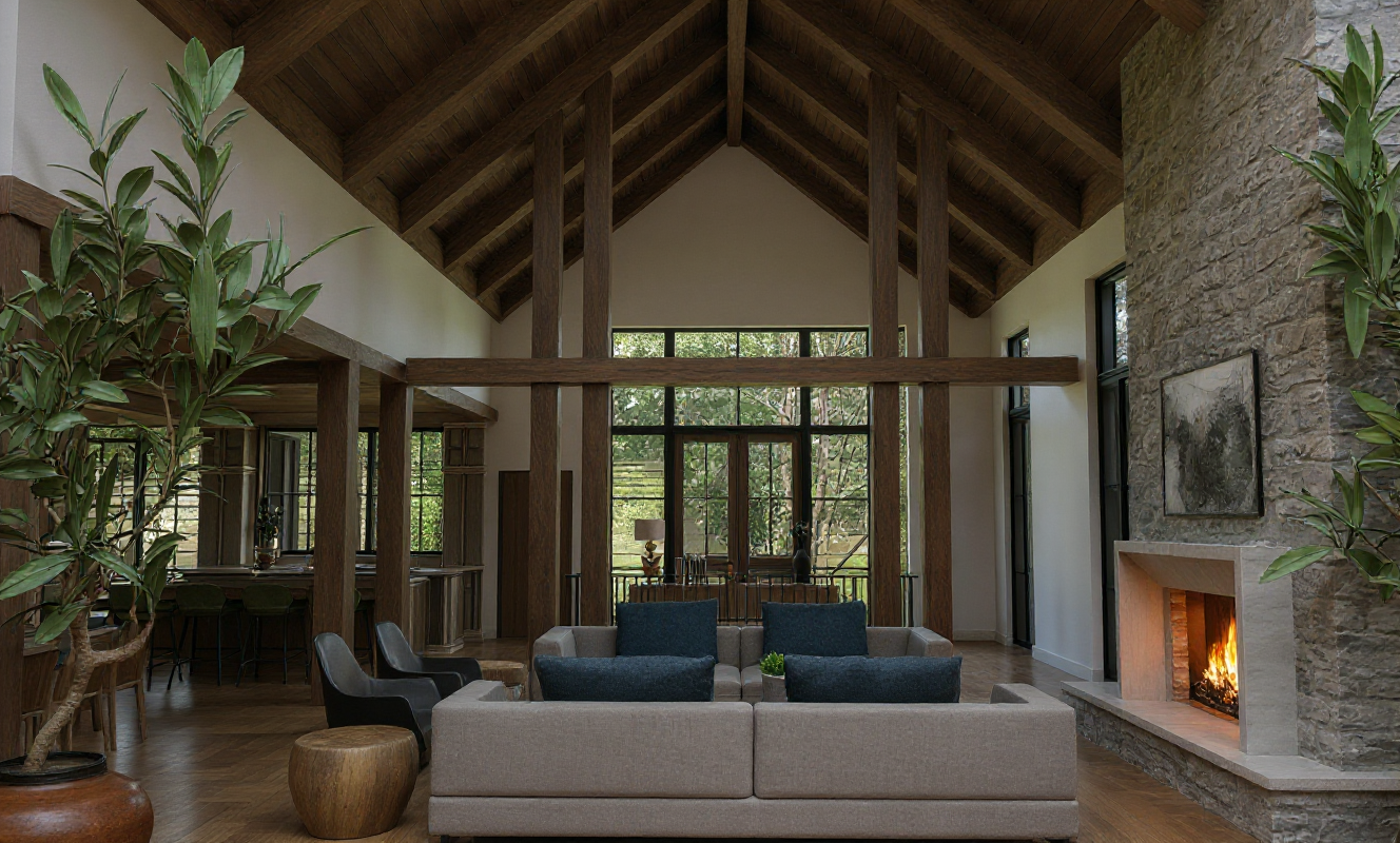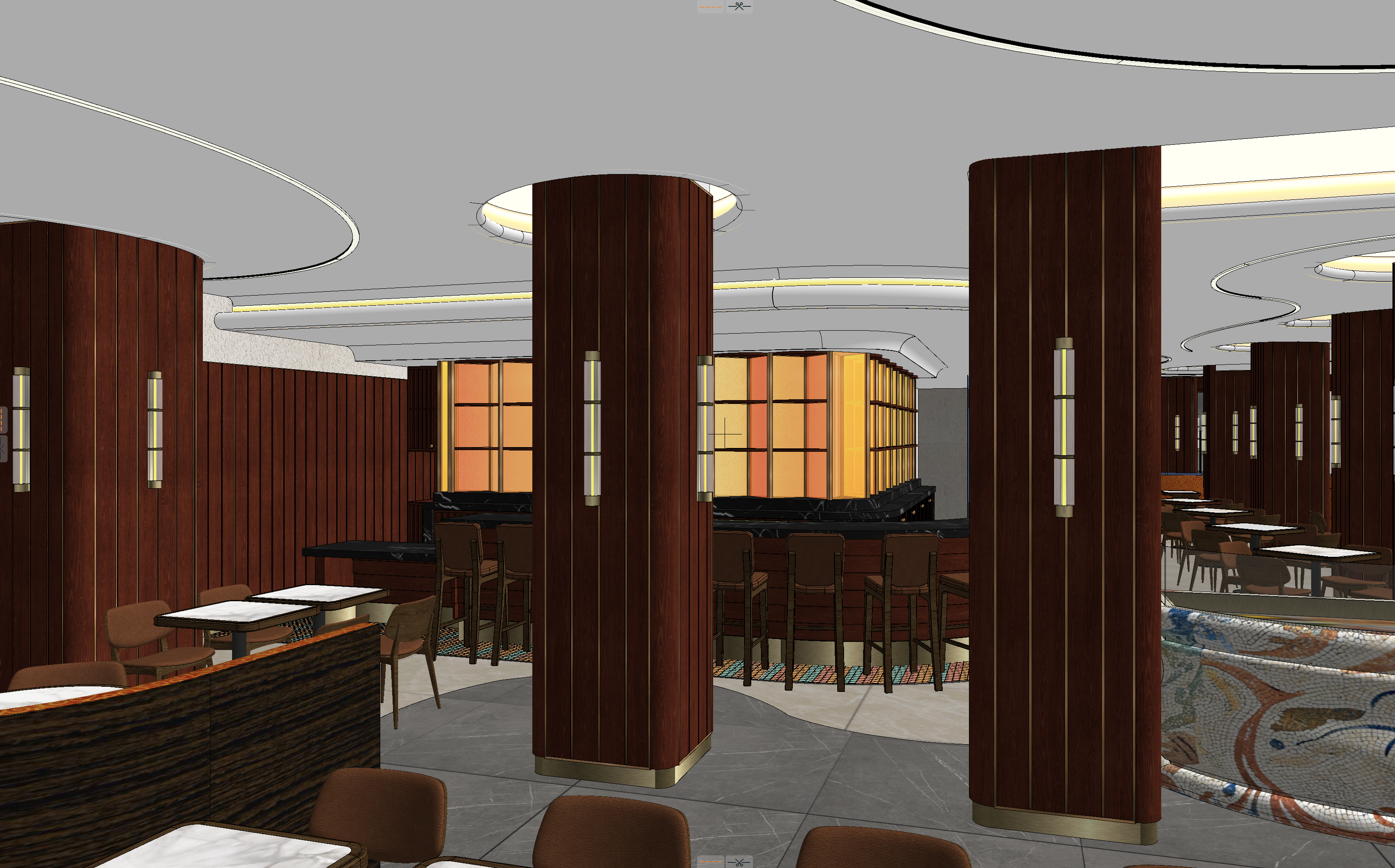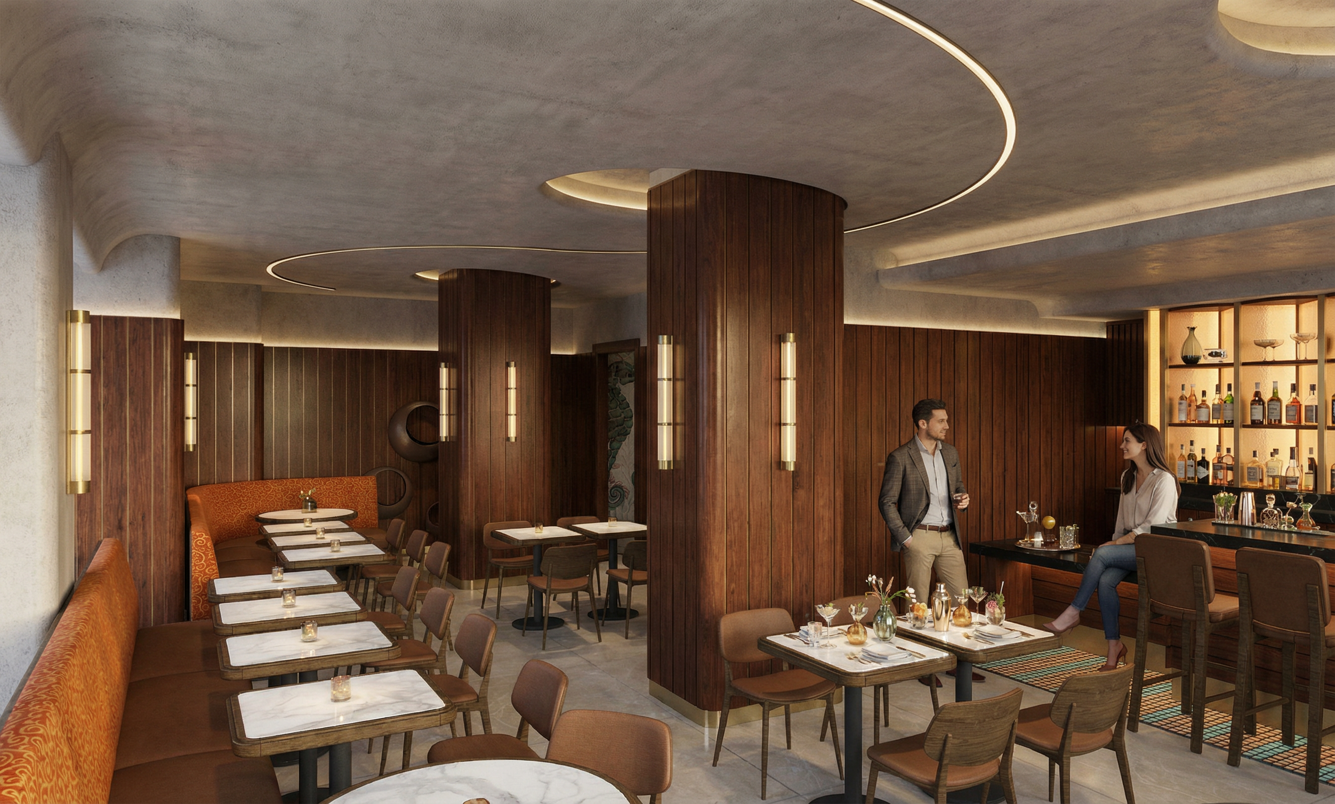 transform the provided restaurant interior image into a high end photorealistic daytime render with a relaxed resort style atmosphere while keeping everything exactly the same same proportions same bar and seating layout same ceiling forms same textures same materials same colors same furniture arrangement and same spatial composition do not modify or replace any geometry objects or design elements add a rich level of restaurant preparation d cor as if just before opening bar top decorated with cocktail glassware bottles vases fresh garnish elements polished service items and elegant presentation pieces on the shelves behind the bar arrange premium alcohol bottles and glassware in an appealing display integrated into the existing shelving without altering its structure add tabletop settings on several tables plates cutlery napkins small vases candles glassware while keeping all tables and chairs exactly where they are include 2 3 people in the scene casually positioned a couple near the bar and one seated at a table dressed in relaxed upscale resort attire interacting softly and blending naturally into the environment without blocking major sightlines lighting should reflect bright daytime illumination with a relaxed coastal resort feel combined with soft architectural accent lighting from bar backlighting and ceiling coves enhance photorealism with material depth fabric texture warm wood sheen marble reflections subtle shadows and polished catalog style clarity while keeping the entire interior design unchanged