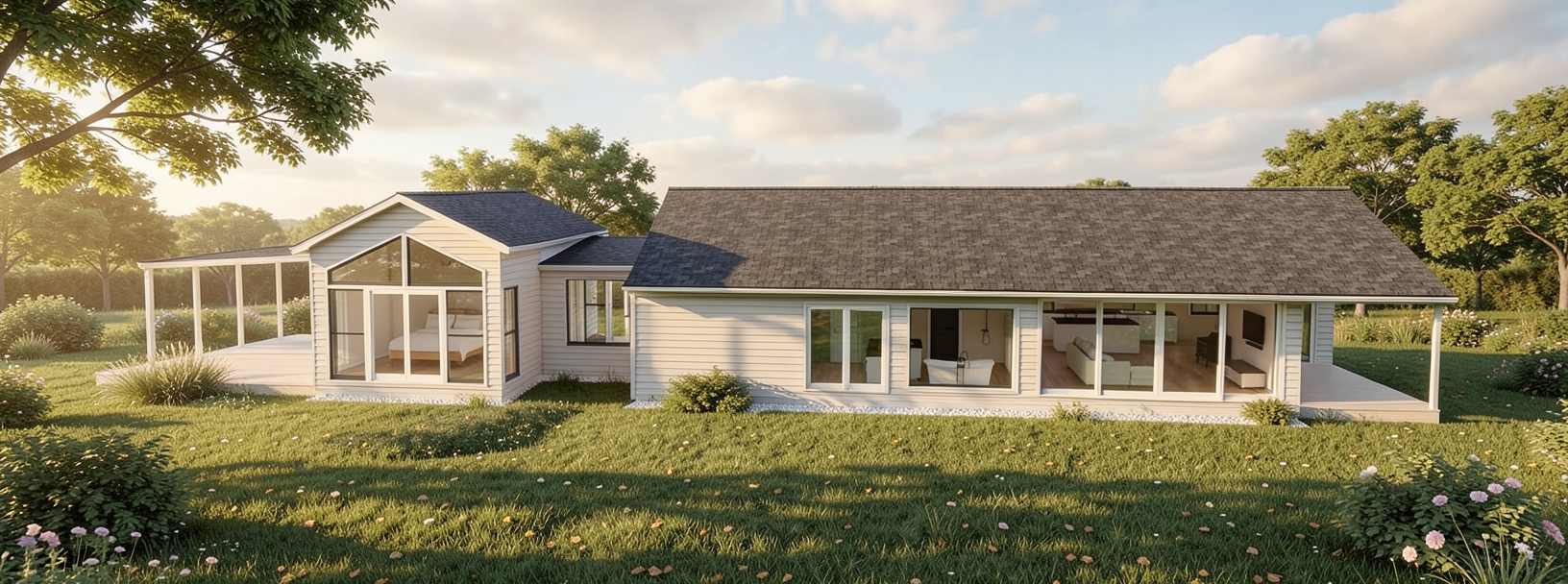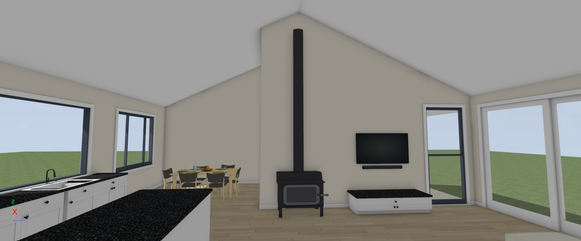 modernist exterior shot modern barn style open plan living and dining space with a dramatic vaulted ceiling feature oversized exposed structural timber beams with deep profiles evenly spaced creating strong architectural rhythm ceiling lined with warm natural timber boards tongue and groove high pitch with visible ridge beam make the ceiling the hero bold heavy beams high contrast shadows architectural depth not flat or minimal include a full height fireplace feature wall extending from floor to ceiling finished in smooth rendered plaster or dark textured material centered under the gable fireplace tall and vertical visually striking reaching the ridge line large triangular highlight windows in the gable above the fireplace with full height black framed glass doors either side interior styling long solid timber dining table soft neutral palette warm oak floors minimal furniture kitchen to the side with dark cabinetry and clean lines lighting soft natural light with strong directional shadows to emphasise beams and ceiling structure architecture