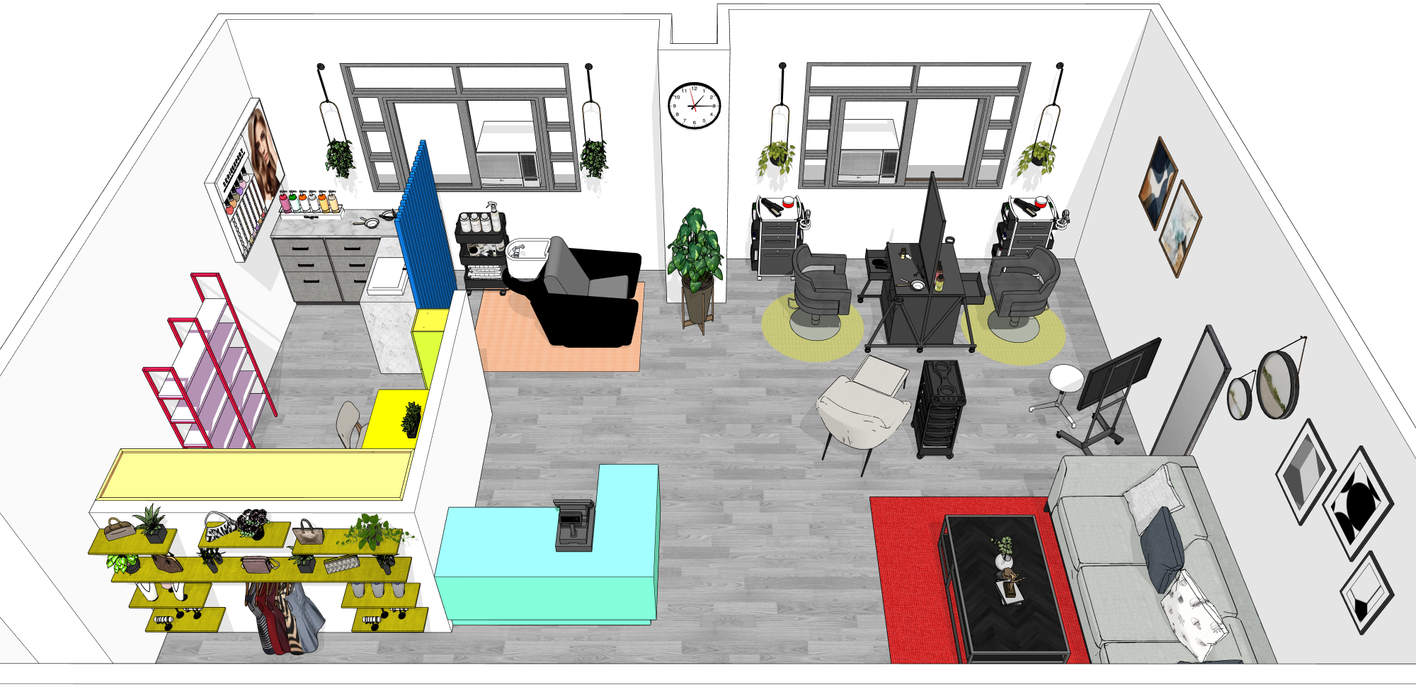 create a subtle render of this top view perspective keep the original view and maintain all the color materials make it warm and bright the floor is gray and the walls are tulle white the rugs are bright colored instead of brown