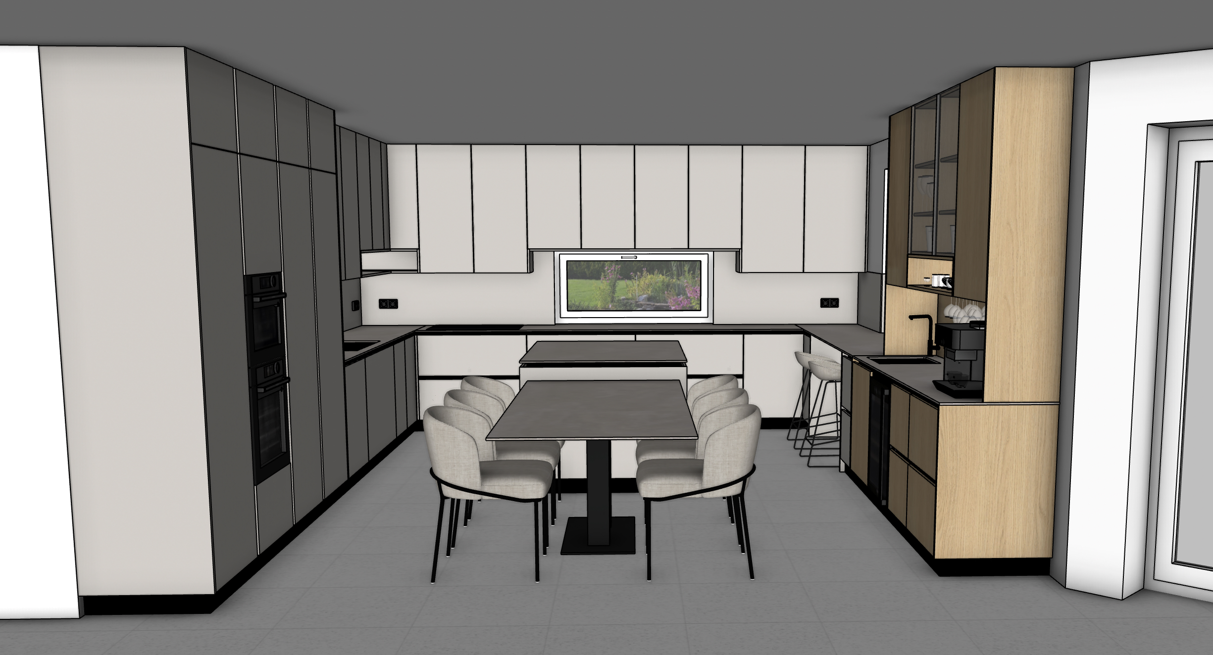 photorealistic render of the uploaded sketchup kitchen image preserve exact camera angle and all original textures materials no redesign add realistic warm led under cabinet lighting ceiling lights and sunny daylight from outside with global illumination and natural shadows ultra realistic architectural photo ray traced 8k