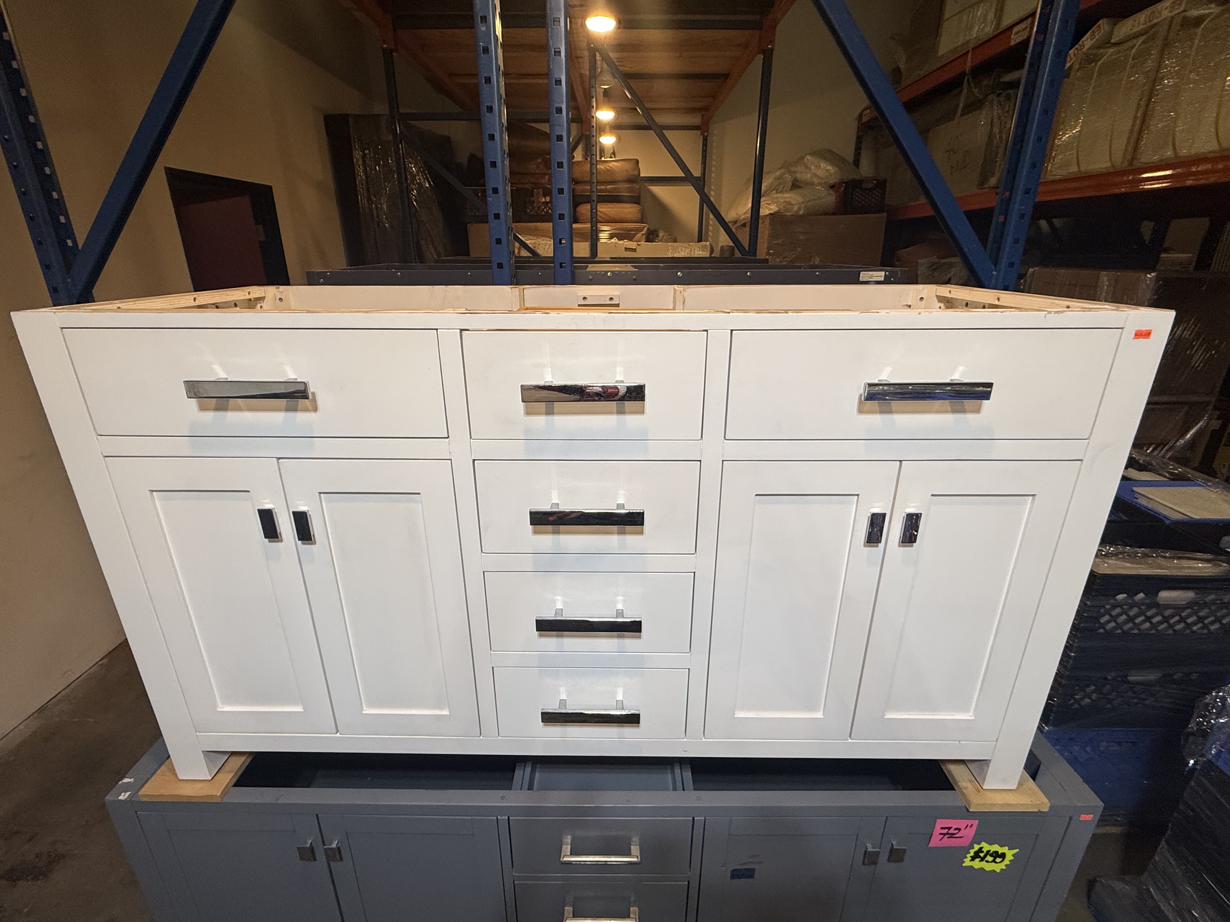 create the 60 in double sink vanity in a luxurious showroom with kbf home improvement logo on the top or on the bottom of the image