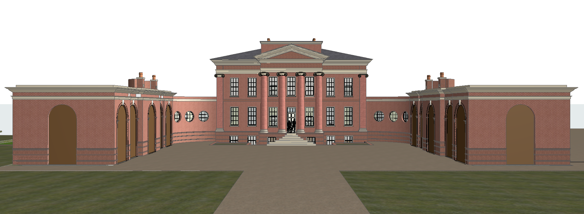 render a majestic neoclassical building with six large brick columns in front made of red brick and adorned with cream colored stone details the windows are tall and grand reflecting the afternoon light the sky is a clear blue with a few fluffy clouds adding a serene atmosphere the foreground features a wide walkway with subtle shadows enhancing the historical feel create a warm welcoming ambiance highlighting the architectural elegance of this traditional structure