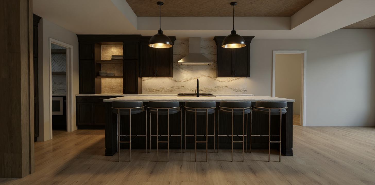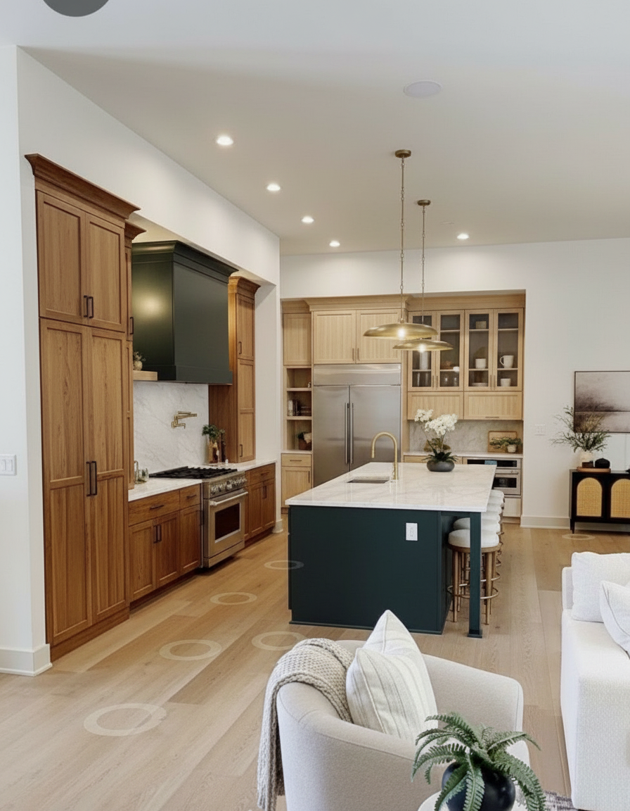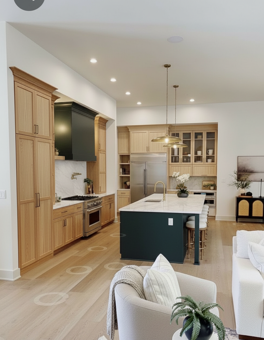 make the stain a little bit darker white oak on all of the cabinets that are currently painted cream on the back wall and on the wall on the far right side of photo make the range hood iron or paint color