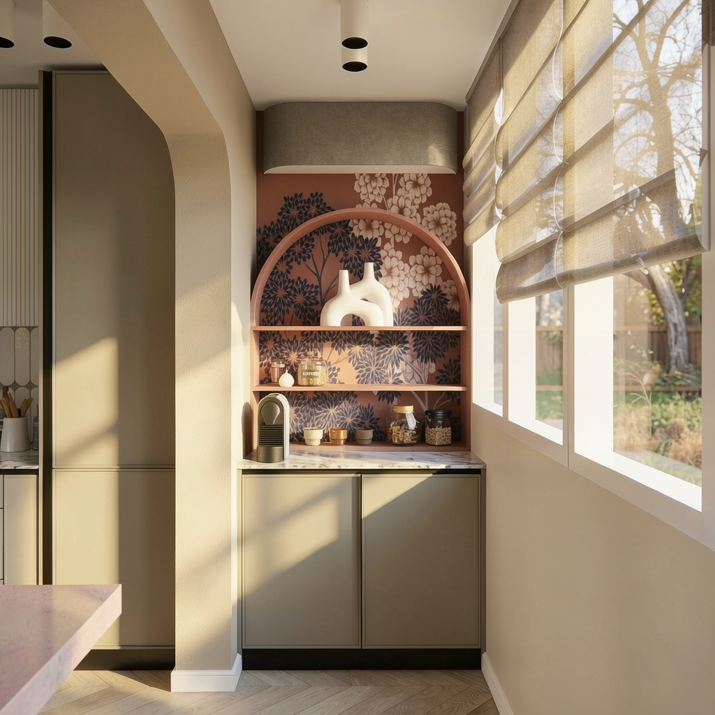 the settee is travertine laminate do not make the mirror so reflective that it shows the opposite side the cabinets are a light beige colour the floor is light beige granite the ceiling is white