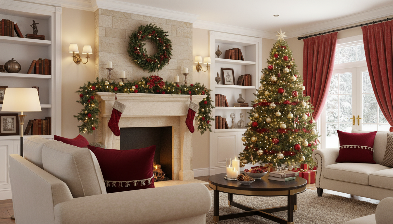 cushion in the foreground as a gift under a little christmas tree in a house decorated for christmas