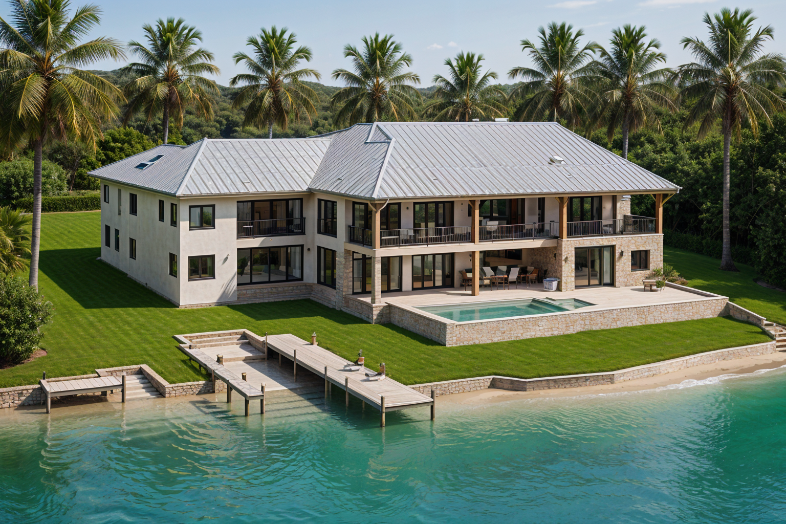 modern home on bay the white foreground in the drawing is actually turquois bay water which goes all the way up to the stone rip rap and lawn there is a dock in the left foreground as shown the background is lush tropical hardwood with palm trees the house is light colored with coral stone facade along the lower level of the home the pool and spa are infinity edge the roof is light colored metal on the right front of the house there is a spiral staircase that leads down to the pool deck which is depicted in the drawing make water in foreground deeper take out tree on deck on right side and put spiral staircase as depicted in the original drawing