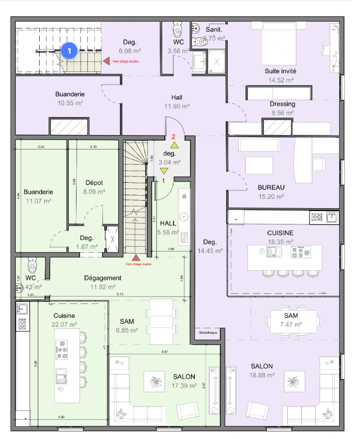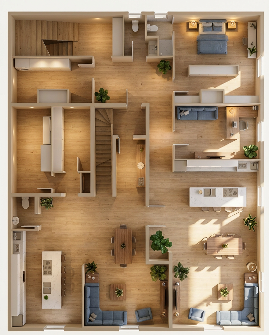 generate a 3d rendering of a modern 2 appartment interior based on the floor plan use warm neutral tones such as soft beige for the walls and add wooden textures in light oak for the flooring create a cozy atmosphere with natural light streaming through large windows in the salon and sam highlighting a plush sofa in muted blue and a dining table with elegant minimalistic design add indoor plants for a fresh touch and ensure the kitchen is styled with sleek white countertops and stainless steel appliances use gentle lighting to create a warm inviting ambiance throughout the space