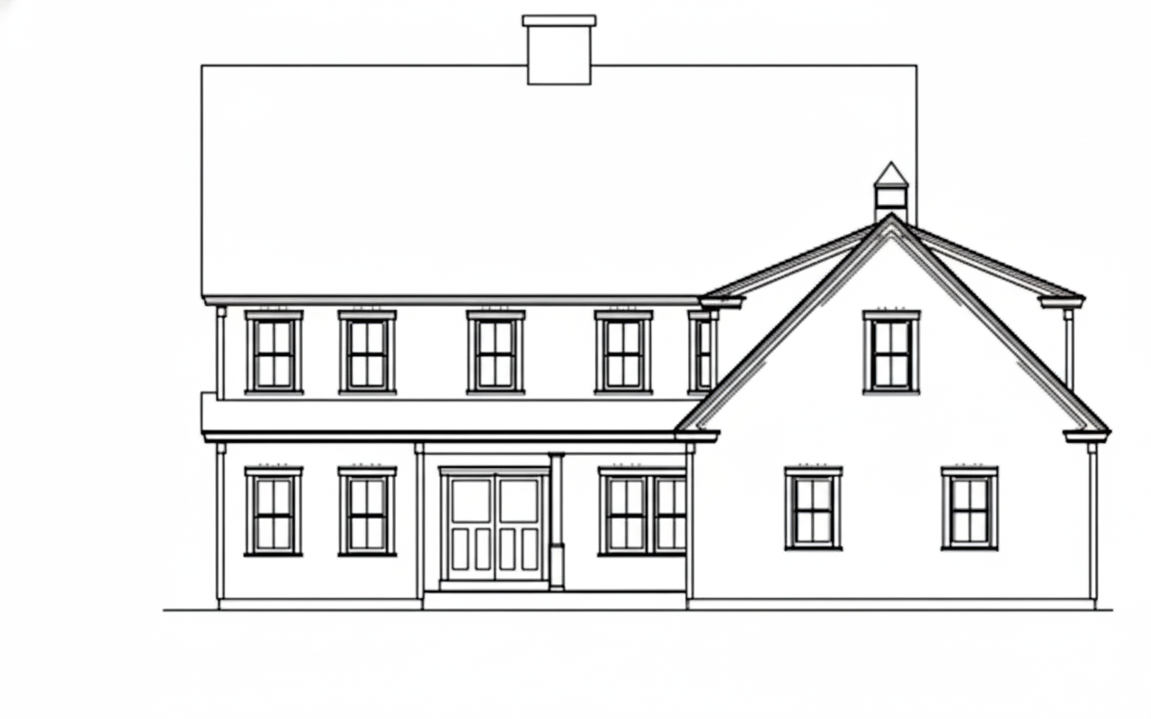 create a photorealistic depiction of a traditional two story house featuring a warm beige facade with white trim around the windows and doors the roof is a soft slate gray with subtle texture and there s a classic chimney include lush green grass surrounding the house with colorful flowers in the garden the sky is a clear blue with a few fluffy white clouds casting soft sunlight that creates gentle shadows the overall atmosphere is inviting and serene suggestive of a peaceful suburban afternoon