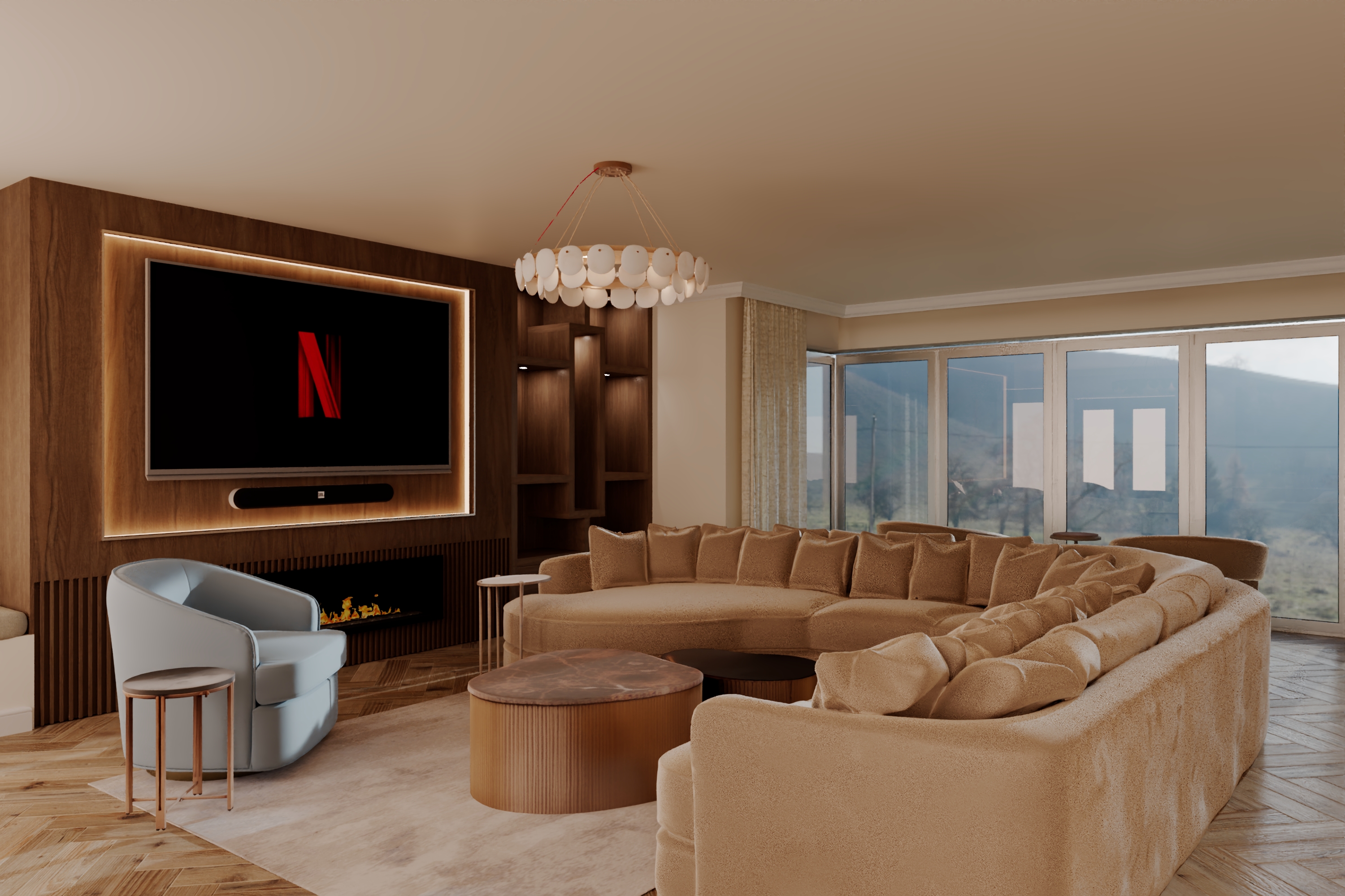 improve the lighting make the sofa slightly lighter beige velvet the armchair is mid blue fabric add neutral decor onto shelves make the fireplace brighter make sure the panelling around the fireplace is wood and blends in make the wood finish like oak add decor on coffee table