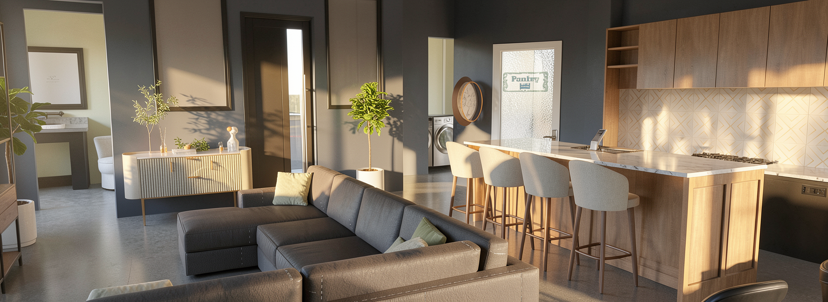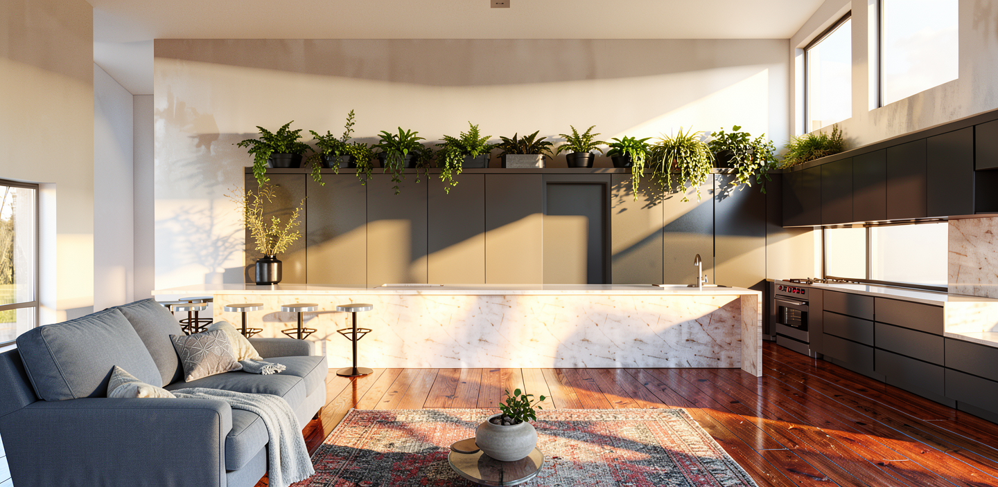 create two sleek pendant lights over the island bench