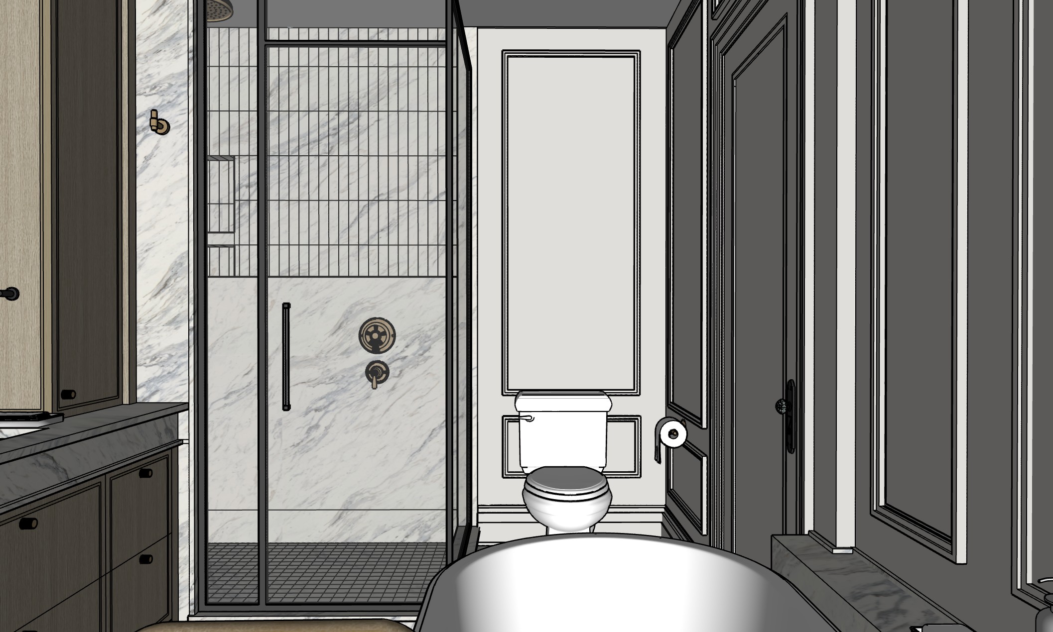 all the walls should be white foor tile should be the same white marble as the wall tiles