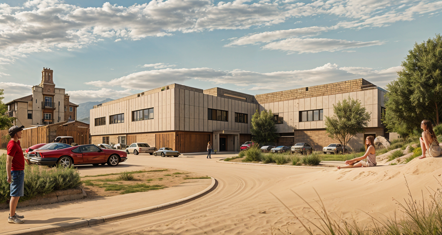 sport center lounge with a reception desk floor textile squares mixed with dark yellow and blue light oak and light stone on desk info screen on the wall architecture
