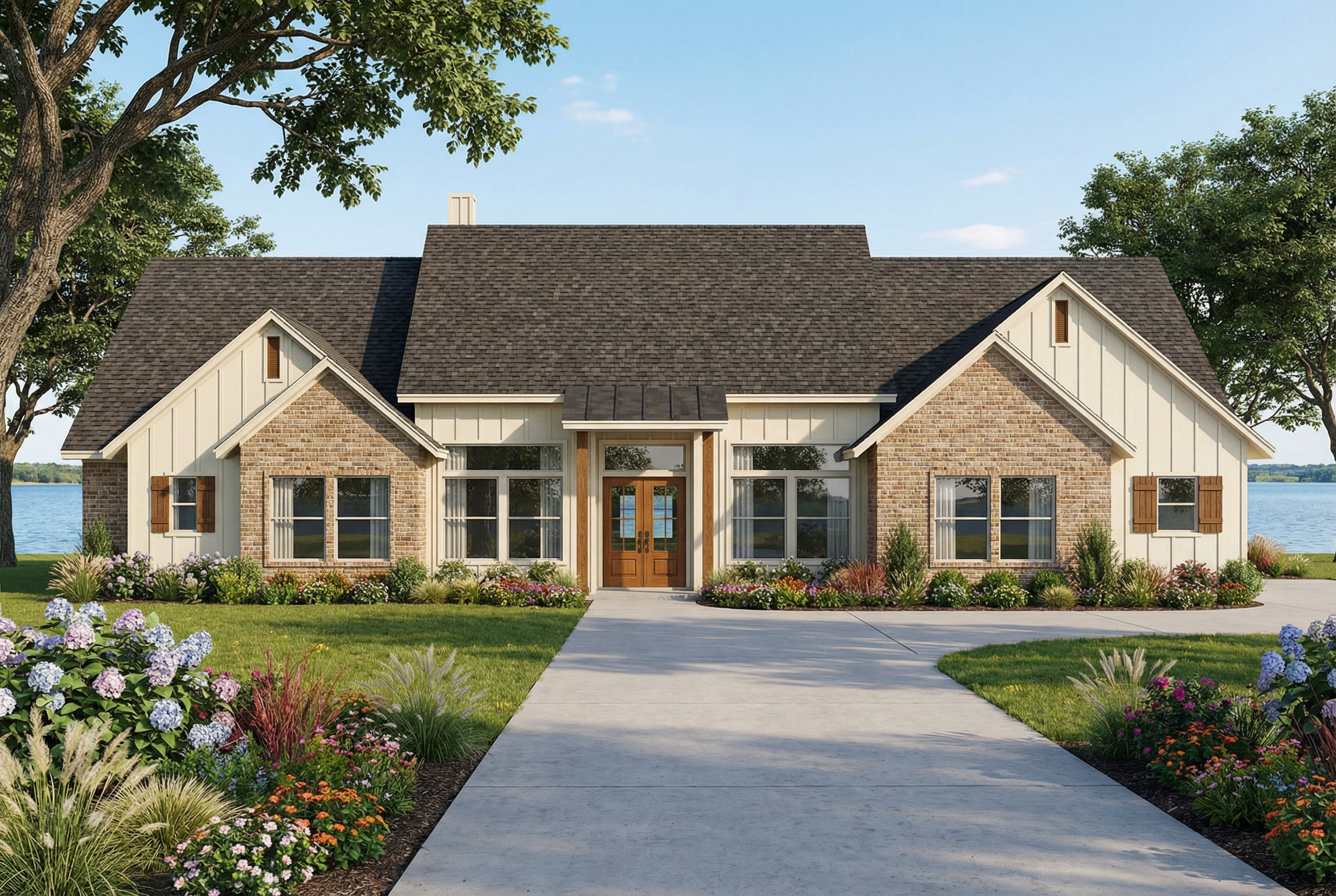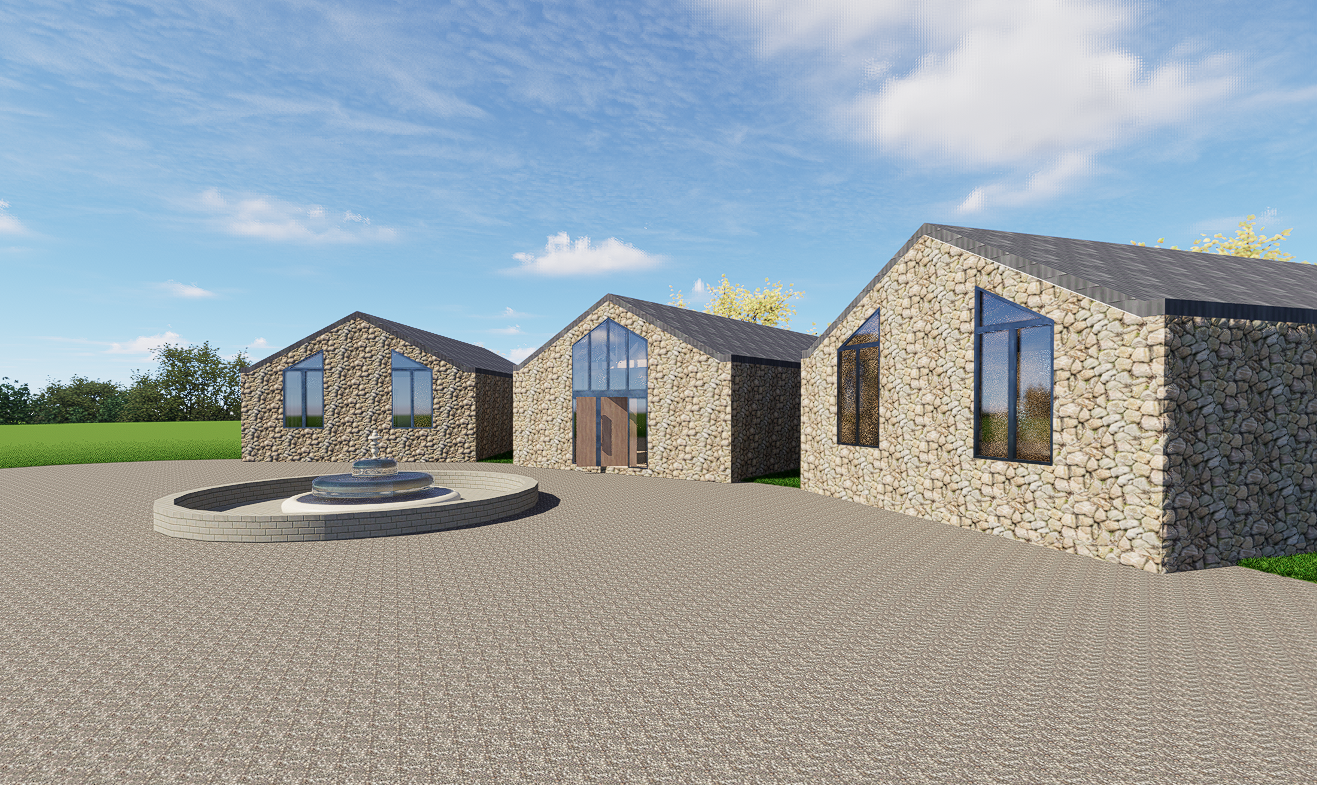 make this external image look more realistic i want the walls to look like a stone cottage style with a slate black roof make the ground a nice gravel make the wall around the fountain a small hedge wall not brick and make the fountain look more realistic add natural warm light and evenly spaced planters to the front of the buildings