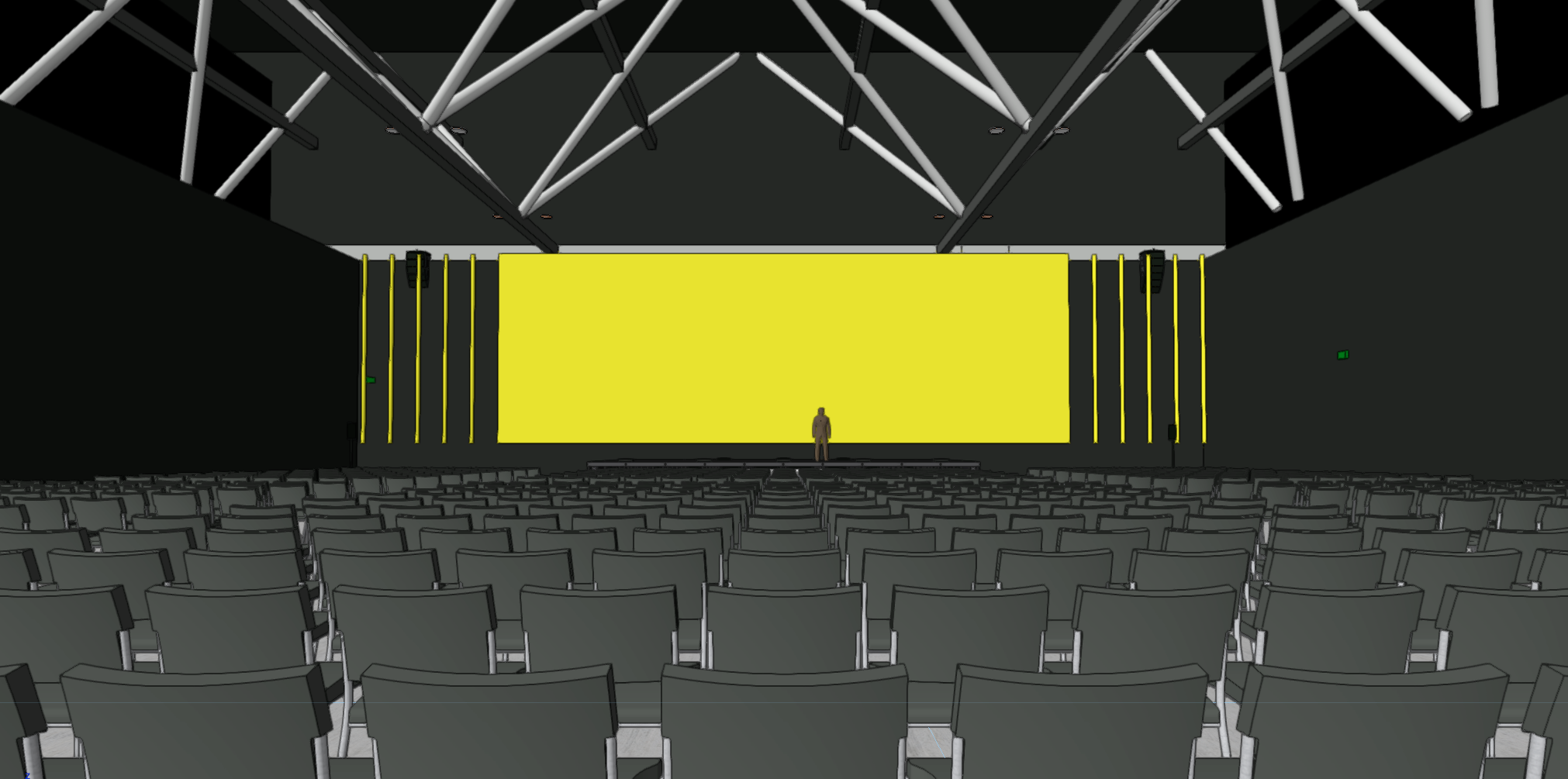 a man stands on stage in the distance within a dark immersive stage environment with an oversized led screen and light tubes behind him illuminated glowing yellow
