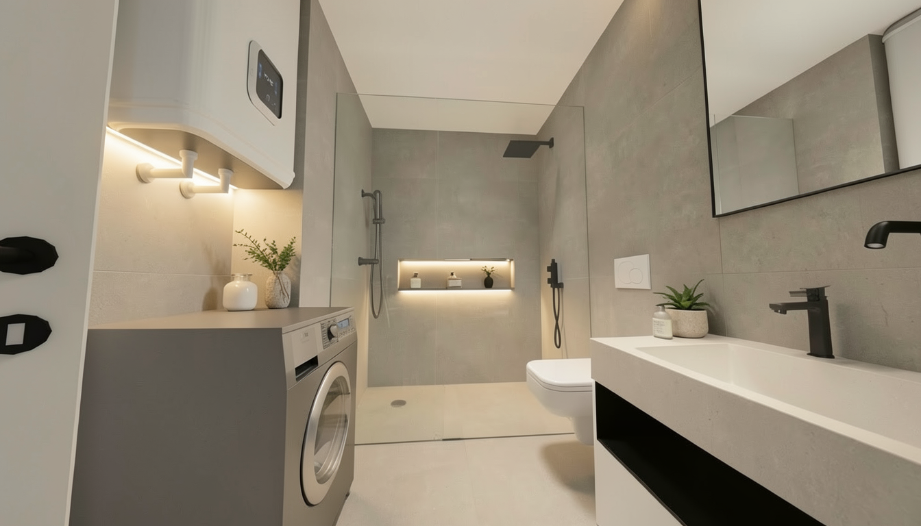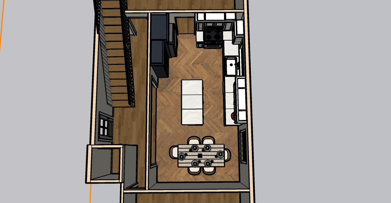 basckplash is a sage subway tile in a stacked pattern the perimeter cabinets are off white the island cabinets are a medium maple color the countertops are a quartz the floor is a medium walnut herringbone luxury vinyl plank the walls are off white the cabinets on the left are a dark navy blue have lighting come down from directly above