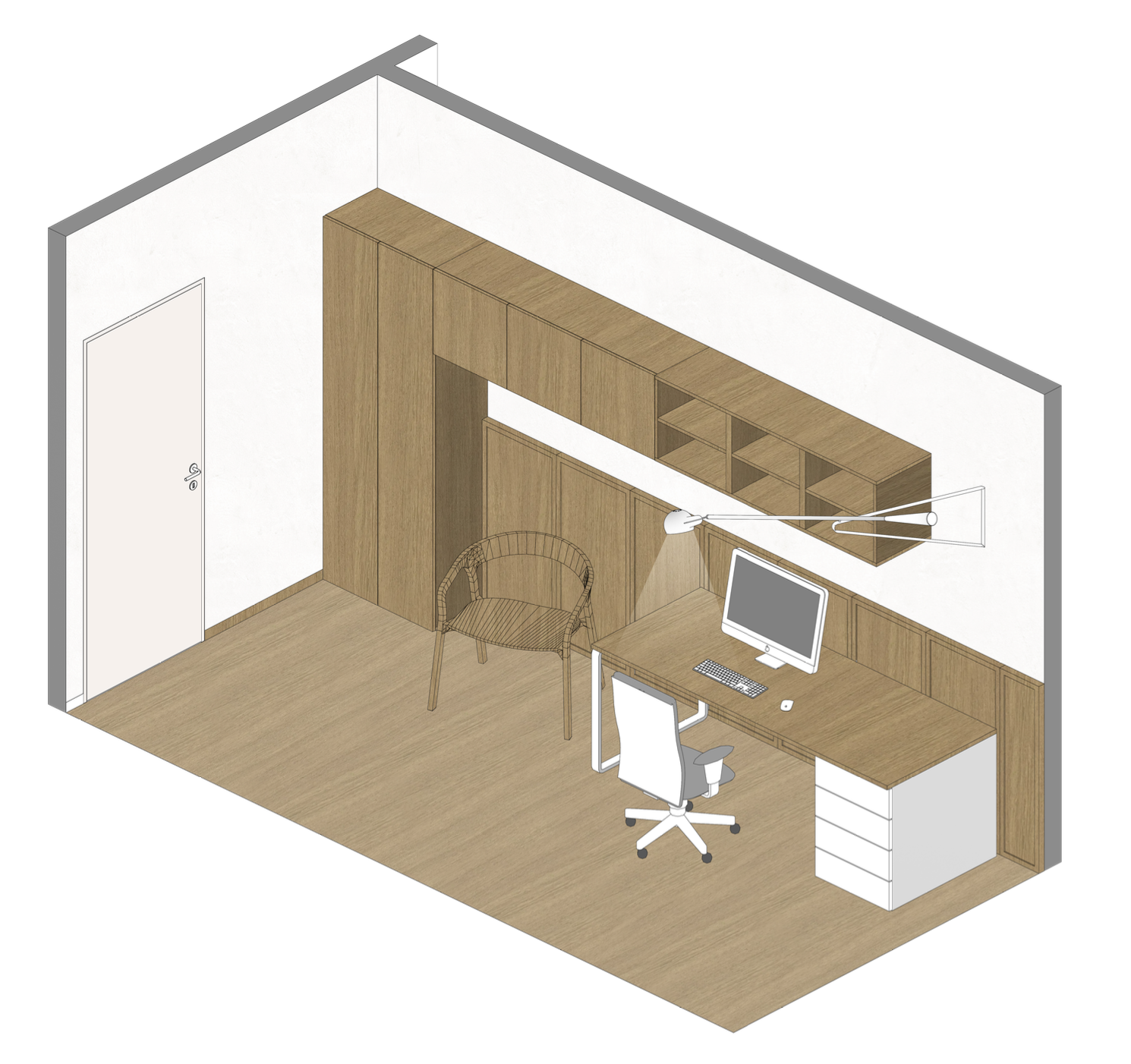 this is an axonometric view can you create a 3d version of this room including material and furniture